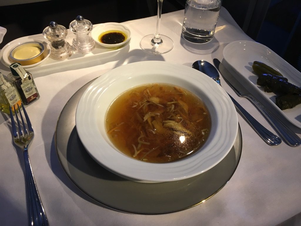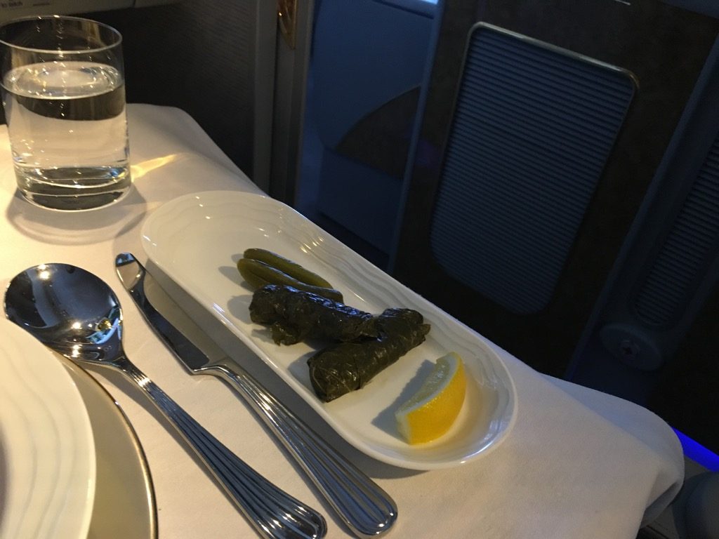 Nachdem ich bei unserem letzten Flug gelernt habe, wie groß die arabische Mezze ist, habe ich hiervon als „kleine Beilage“ nur die gefüllten Weinblätter bestellt. Zusätzlich hatte ich noch eine Suppe als Vorspeise, mit welcher ich ebenfalls sehr zufrieden war.