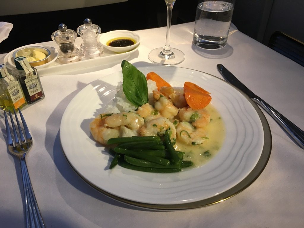 Auf diesem Flug war ich sehr Meerestier-lastig und habe mir als Hauptgericht Garnelen bestellt. Diese sind im Flugzeug immer nicht ganz einfach zuzubereiten, da man sie sehr schnell übergaren kann. Lucia, meine Flugbegleiterin, hat dies allerdings sehr gut hinbekommen, so dass ich nichts zu beanstanden hatte.