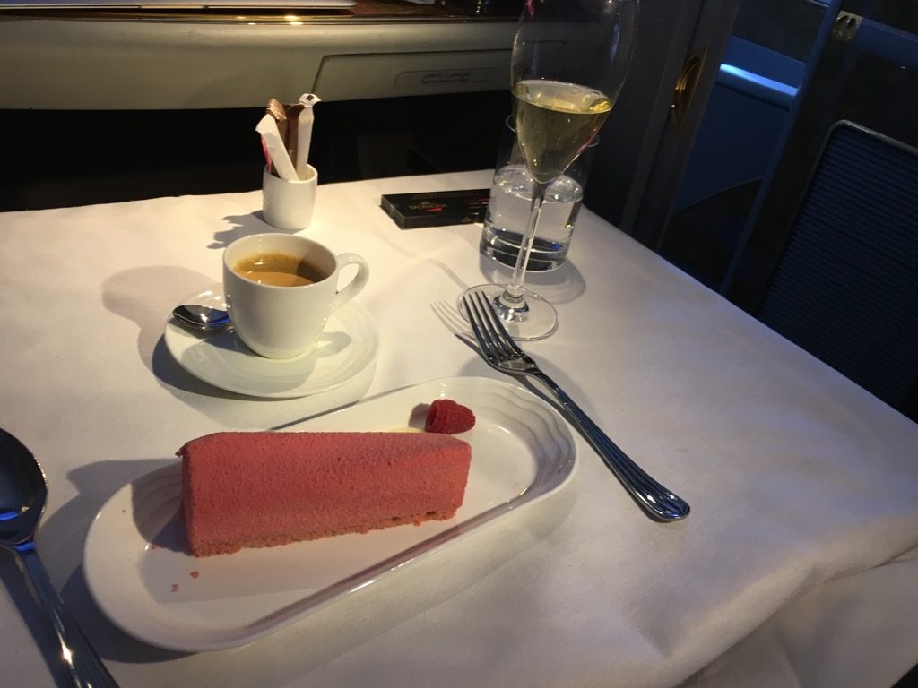 Zum Abschluss des Essens hatte ich neben einem Glas Champagner auch noch einen Espresso und den Himbeerkuchen. Alles zusammen rundete das Menü wirklich wunderbar ab.