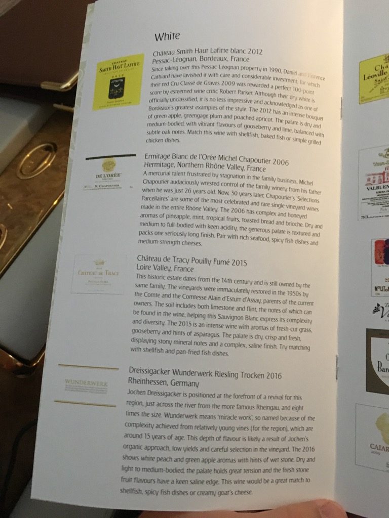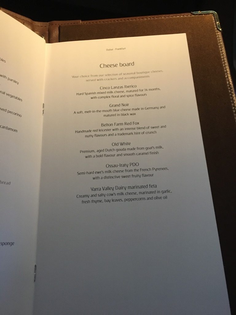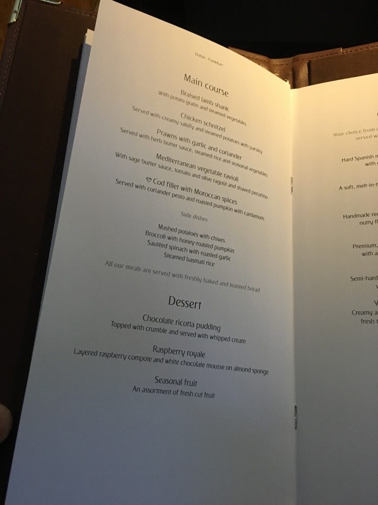Noch vor dem Start wurde uns das Menü für diesen Flug ausgehändigt, mit dem Hinweis, dass wir jederzeit essen könnten und es einfach nur der Crew sagen sollten. Der Flug hat mit einem Abflug um 8.25 Uhr eine etwas anderes Menü. So gibt es ein kleines Frühstück und/oder eine großes Mittagessen.