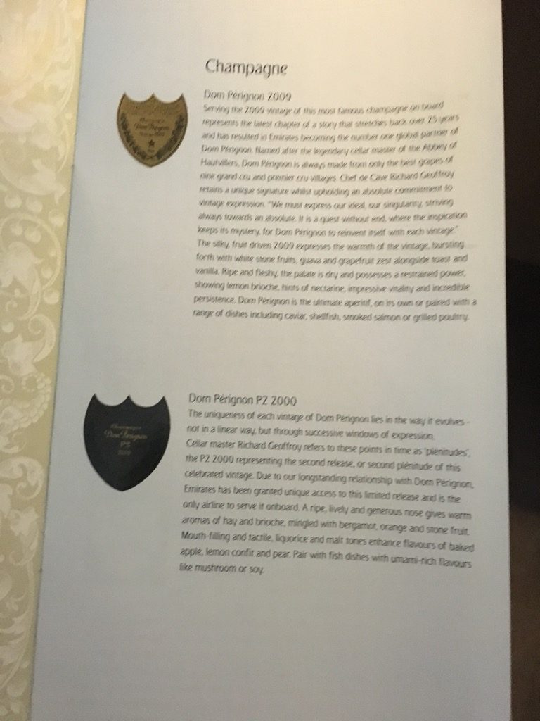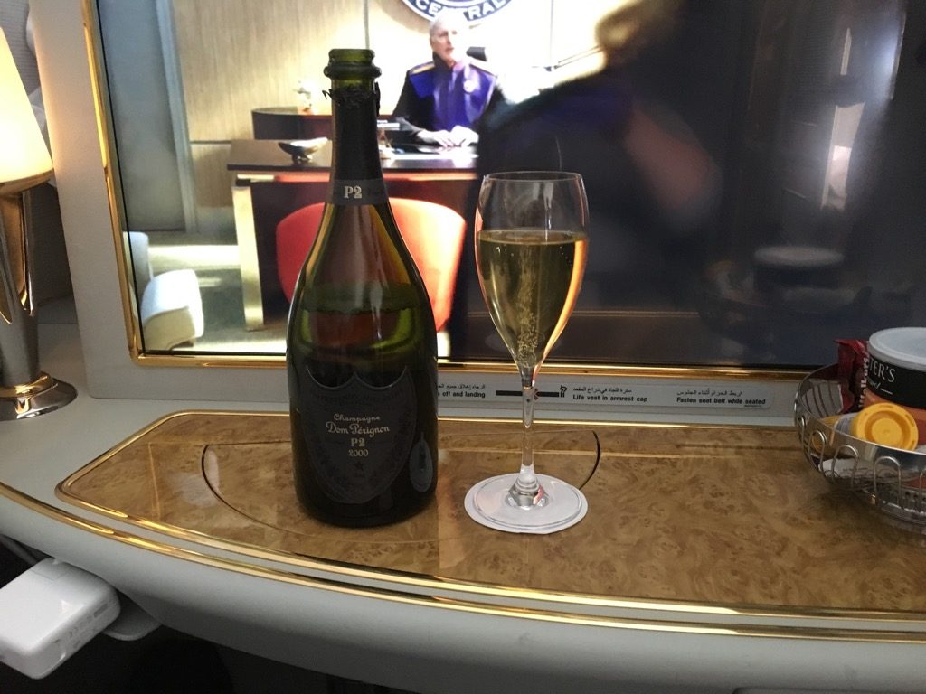 Auf diesem Flug hatte Emirates den Dom Perignon p2 geladen, welche ich mir nicht entgehen lassen wollte. Bei 350 Euro pro Flasche ist dies sicher auch ein nicht alltäglicher Tropfen und wenn man bedenkt, dass wir nur etwa 50 Euro Cash (zzgl. zu den Meilen) für die Flüge von Hongkong über Dubai nach Frankfurt bezahlt haben auch ein exzellenter Gegenwert.