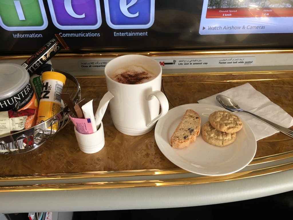 Zur Begrüßung gab es auch auf diesem Flug den traditionellen arabischen Kaffee, welcher mir sogar mehrfach angeboten wurde, nachdem ich sagte, dass ich ihn mag. Zusätzlich habe ich mir noch einen Cappuccino bestellt, was ich bei einem Abflug um kurz nach 8 Uhr am Morgen passend fand. Dieser wurde mir zusammen mit ein paar Keksen und dem Emirates Logo aus Kakao serviert.