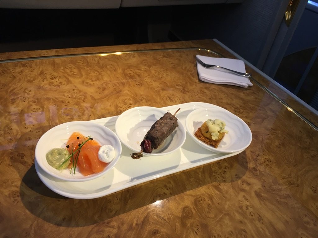 Irgendwo über der Türkei haben wir uns dann dazu entschlossen, mit dem Mittagessen zu beginnen, was unsere zwei Flugbegleiter sofort für uns vorbereitet haben. Als erstes wurde uns vor dem Essen ein heißes Tuch gebracht, sowie die Cannapées zum Champagner.