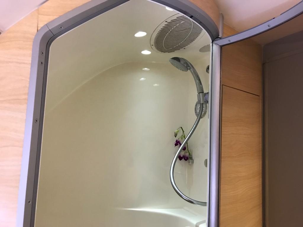 Zum Abschluss dieser tollen Reise habe ich natürlich auch noch einmal das Shower Spa benutzt. Auch wenn es nicht wirklich nötig ist in 40.000 Fuß Höhe zu duschen hat es schon etwas und wenn man in den letzten sechs Stunden eine Flasche Champagner getrunken hat, höre zumindest ich im Bad nicht auf zu grinsen und zu bedenken wie saureal diese Situation ist.