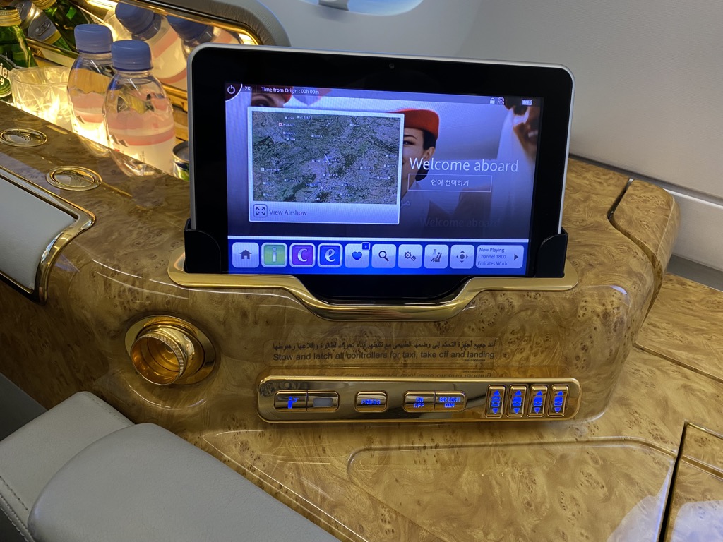 Der gemütliche individuell verstellbare First Class Sessel ist in einer mit Türen verschließbaren Suite verbaut. Direkt ins Auge sticht der wirklich große Bildschirm, auf dem man sich in dem wirklich vielfältigen Entertainment Programm beschäftigen kann. Bedienbar ist der Bildschirm über ein Tablet, welches am Fenster steht, oder über die in der linken Armlehne verbauten Fernbedienung.