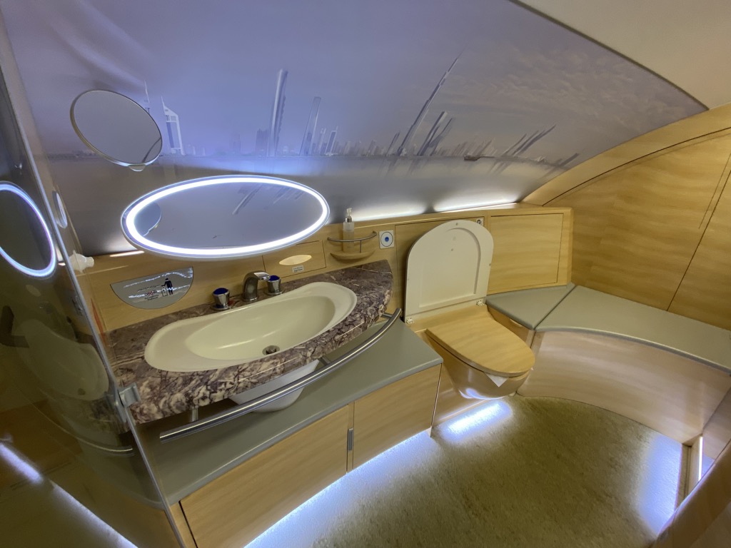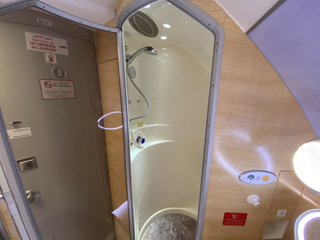 Vor den Sitzen befindet sich der „Spa-Bereich“ von Emirates. Hier sind zwei großzügige Badezimmer inklusive Duschen verbaut. Wir haben diesmal auf eine Dusche verzichtet, da uns der Schlaf wichtiger war. Eine kleine Snack-Bar gibt es gegenüber der Treppe auch noch. Hier lagen coronakonform verpackte Süßigkeiten, Datteln, Sandwiches und Obst bereit.