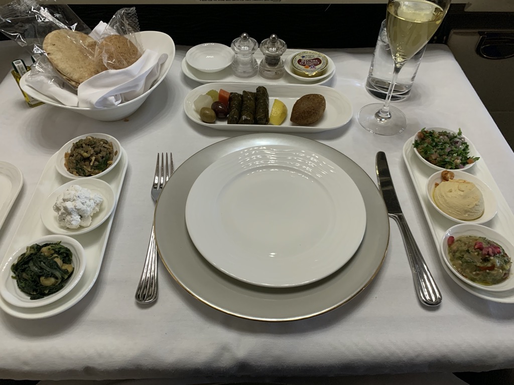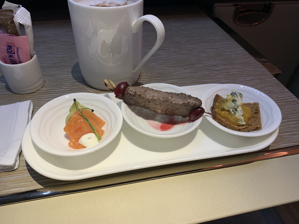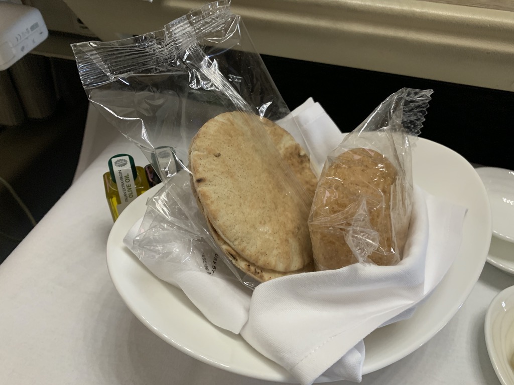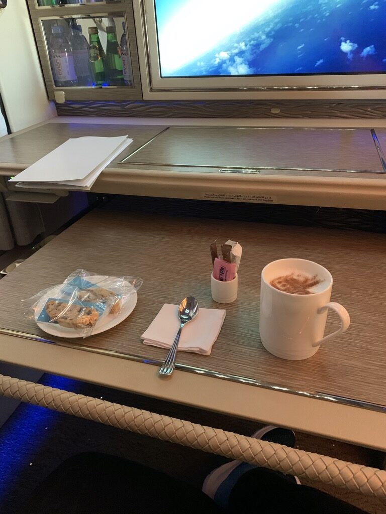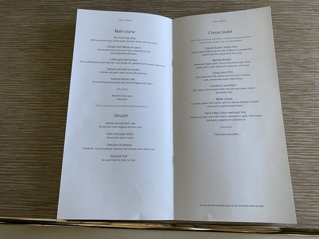 Bei Emirates wird der Service nach dem Dine on Demand Prinzip durchgeführt. Das heißt, dass es keine festen Servicezeiten gibt und man essen kann, wann man möchte. Dieses Konzept finde ich persönlich sehr angenehm, zumal man oft schon in der Lounge ein paar Kleinigkeiten isst und die erste Zeit auf dem Flug keinen Hunger hat. Dies war auch der Grund, warum wir beide auf das angebotene Frühstück verzichtet haben.