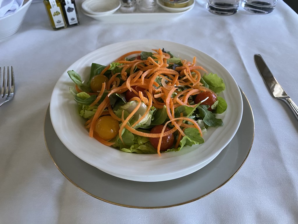 Zur Vorspeise haben wir uns für die arabische Mezze und einen Salat der Saison entschieden. Uns beiden haben die Vorspeisen jeweils gut geschmeckt – einzig das einzeln verpackte Brot hat etwas die Optik gestört.