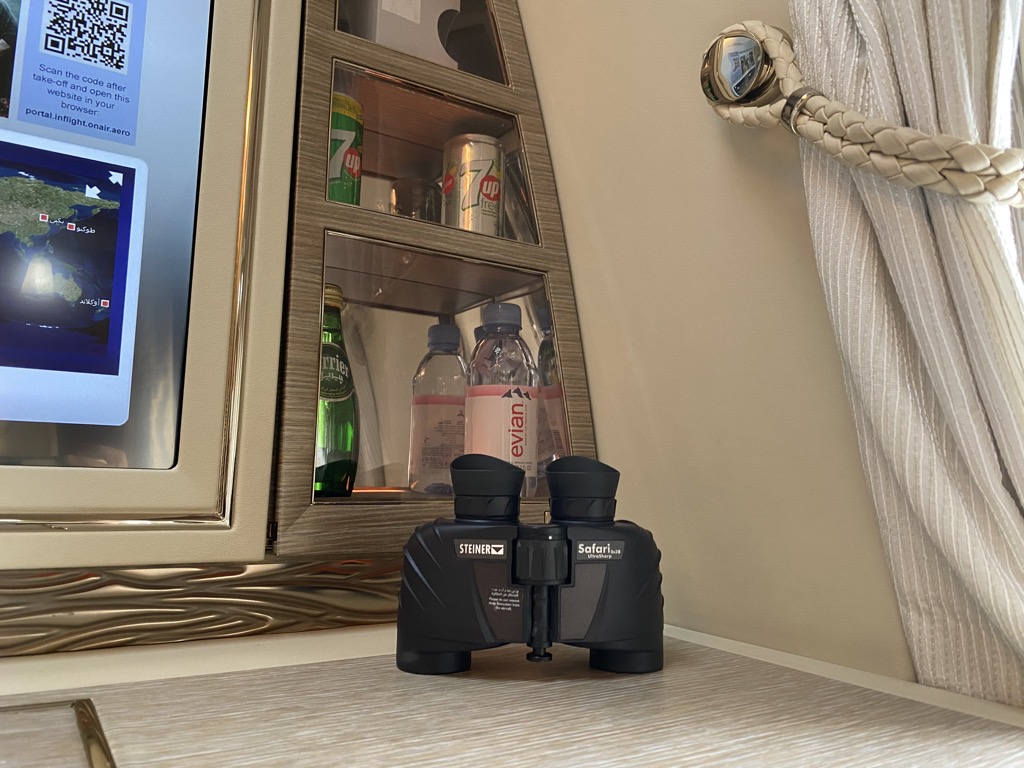 Auf dem Sitz angekommen, war ich überrascht, dass die Suite noch großzügiger war, als bei dem Hinflug in der „alten“ First Class. Auch das Design fand ich persönlich deutlich hübscher als das ganze Wurzelholz mit Gold. Die Kabine wirkte deutlich moderner und „cleaner“, was ich sehr mag. Und obwohl es deutlich cleaner wirkt, bietet die Suite einige Spielereien, wie ein Fernglas, verschiedene Lampen, eine Bar und ein Schminkspiegel, ohne dass es überladen wirkt.