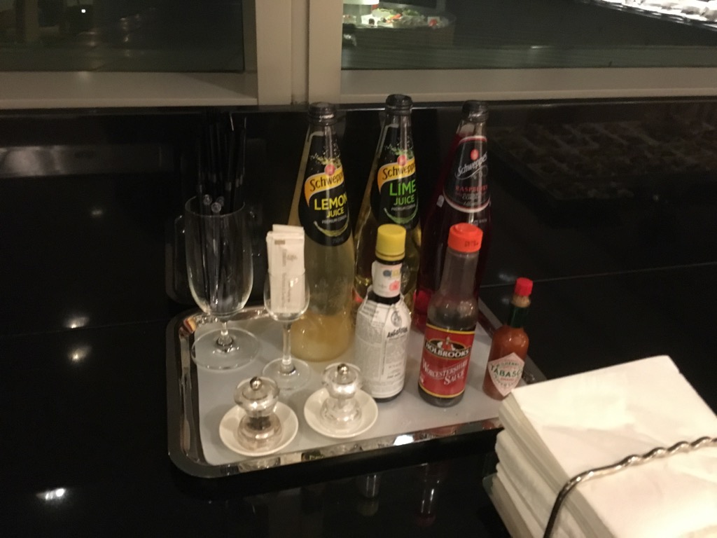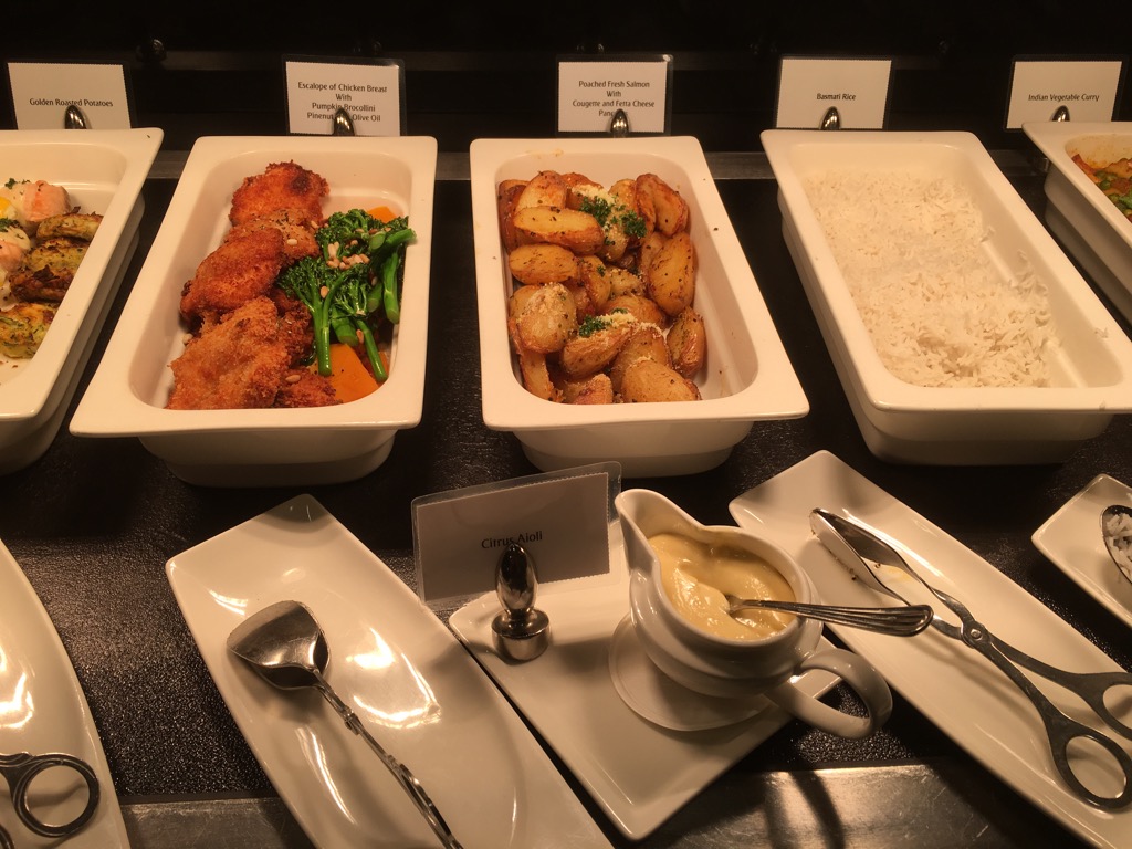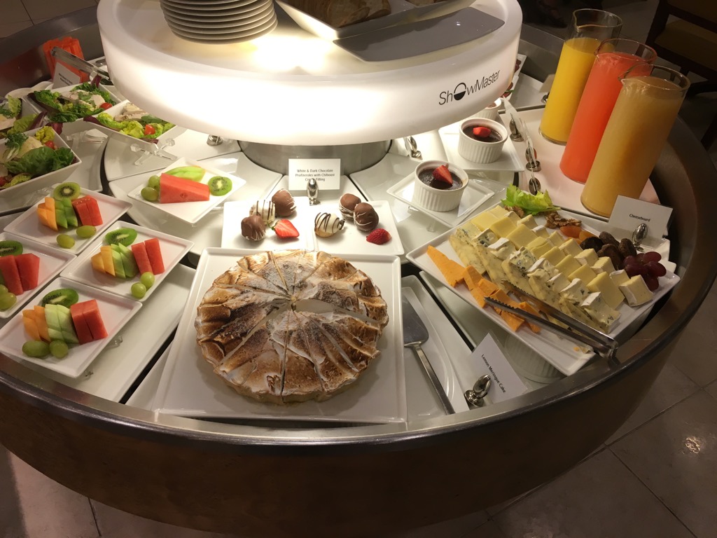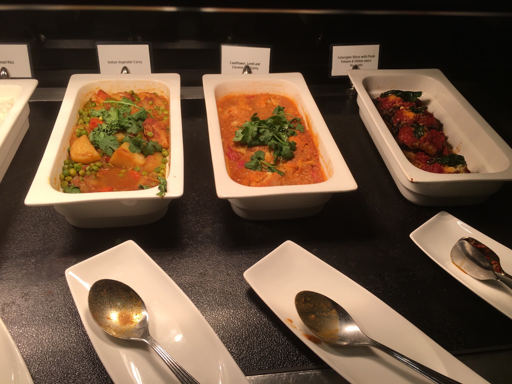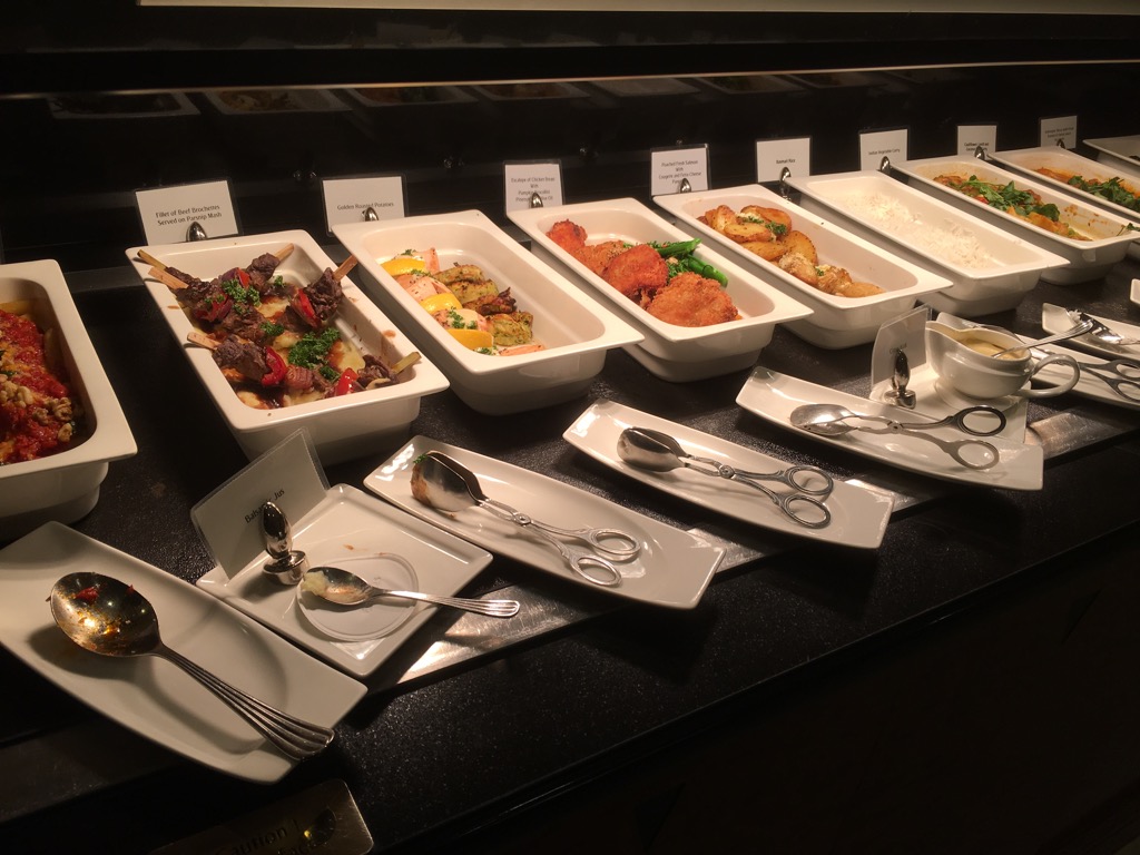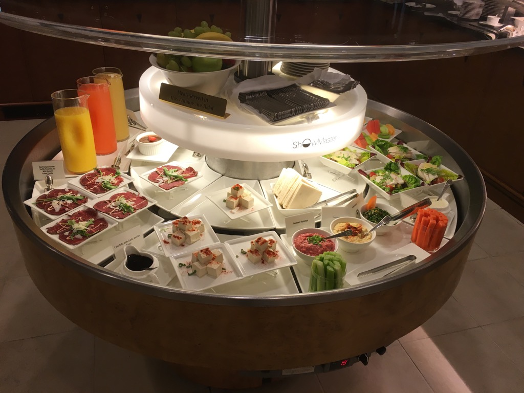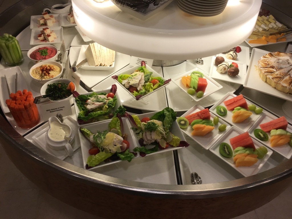 Auf dem Buffet im Restaurantbereich findet man mehrere verschiedene warme Hauptspeisen, sowie kalte Vorspeisen, Salate und Desserts. Grundsätzlich ist das Angebot sehr umfangreich und man kann hier problemlos eine vollständige Malzeit vor dem Flug einnehmen, allerdings verzichtet man beispielsweise im Gegensatz zur Etihad Lounge in Melbourne auf ein a la carte Menü.
