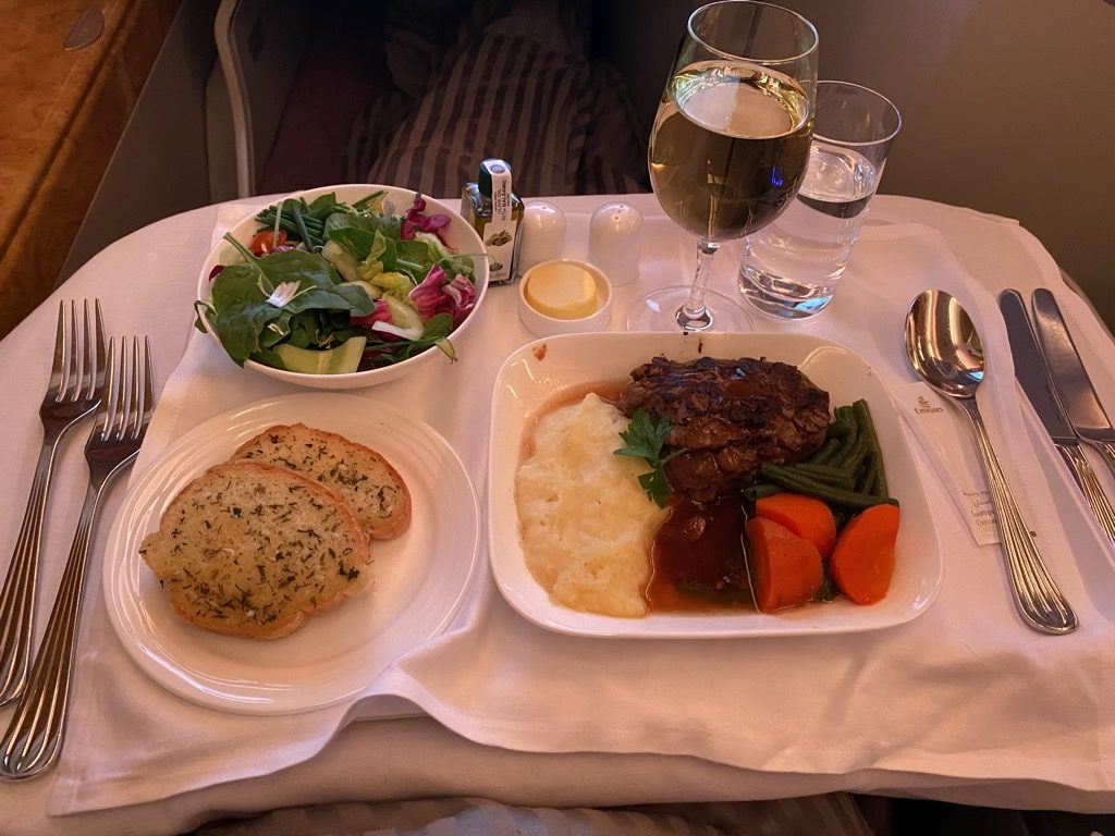 Der Service begann prompt und mir wurde das leckere Tenderloin samt Kartoffelpüree und Möhren sowie Bohnen auf den Tisch gestellt. Dazu gab es wieder sehr leckeres Knoblauchbaguette sowie einen kleinen Salat. Alles in allem ein gutes Gericht für einen kürzeren Flug.
