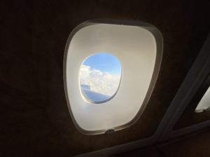Erneut flog ich in einem der 115 Airbus A380 von Emirates. Diesmal wurde ich jedoch beim Betreten des Upperdecks überrascht, da Emirates auf so einer „kurzen“ Strecke ein neueres Produkt einsetzt, als auf einer „wirklich langen“ Strecke. Dass die Kabine neuer sein muss, habe ich sofort am Eingang und später am Sitz mitbekommen, denn beides wirkte frischer und nicht mehr so übergoldet. Jedoch war und wird die Kabine nie so schick aussehen, wie in einer neuen Boeing 777-300, welche Christoph schon geflogen ist.