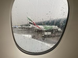 Noch am Boden wurden die Speise- und Getränkewünsche aufgenommen und mein letzter Flug begann Richtung Startbahn zu rollen, um das regnerische Dubai zu verlassen.