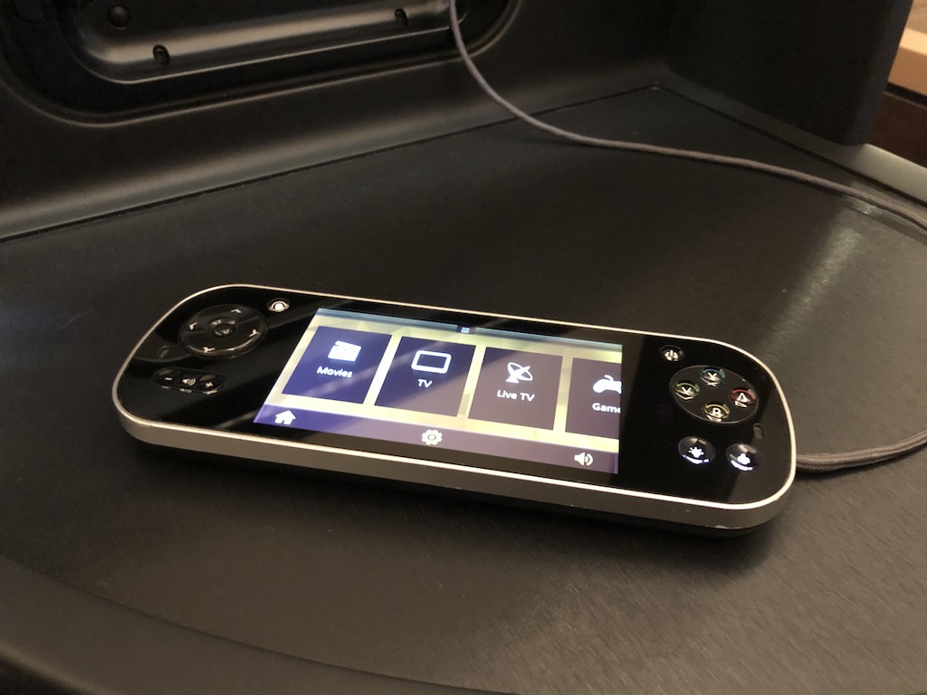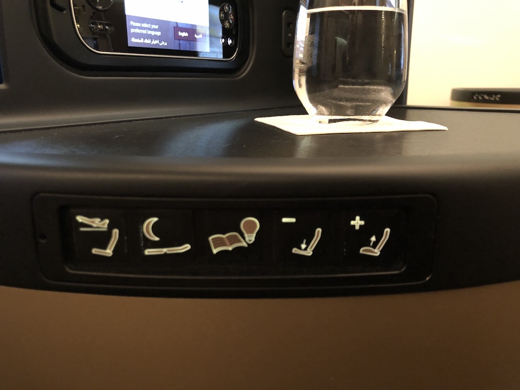 Direkt an einer Ablage ist die elektronische Verstellung für den Sitz angebracht, darüber befindet sich ein Touchpad um z.B. die Beleuchtung zu regulieren. Die Fernbedienung befindet sich daneben, dort kann man den Monitor bedienen, mit anderen Gästen kommunizieren oder den kleineren Bildschirm für die Airshow nutzen.