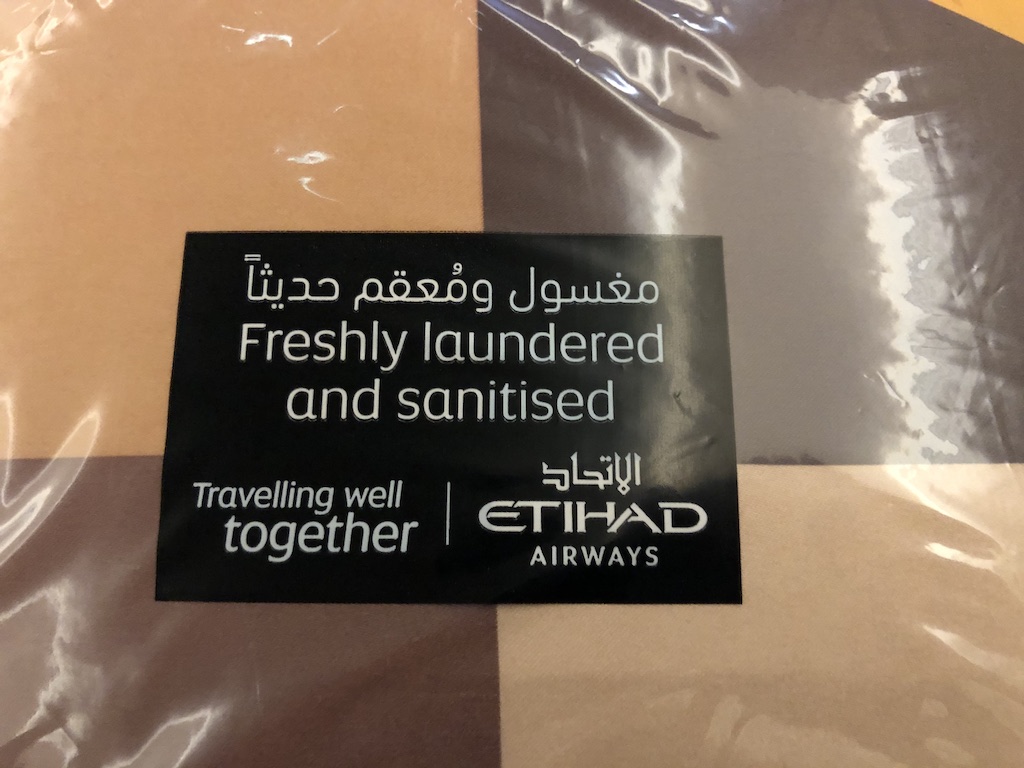 Da die Passagiere der Economy Class nicht durch die Business Class eingestiegen sind, konnten die Flugbegleiter die Zeit nutzen und weitere Dinge verteilen. Ein vollwertiges Amenity Kit gab es für den kurzen Flug nicht. Zu einem Hygienebeutel mit zwei verschiedenen Masken, Handschuhe und Desinfektionsmittel wurden noch Socken sowie eine Schlafbrille ausgehändigt. Interessant war dabei Stoffmaske, die bequem war und auch beim Schlafen nicht weiter störte.