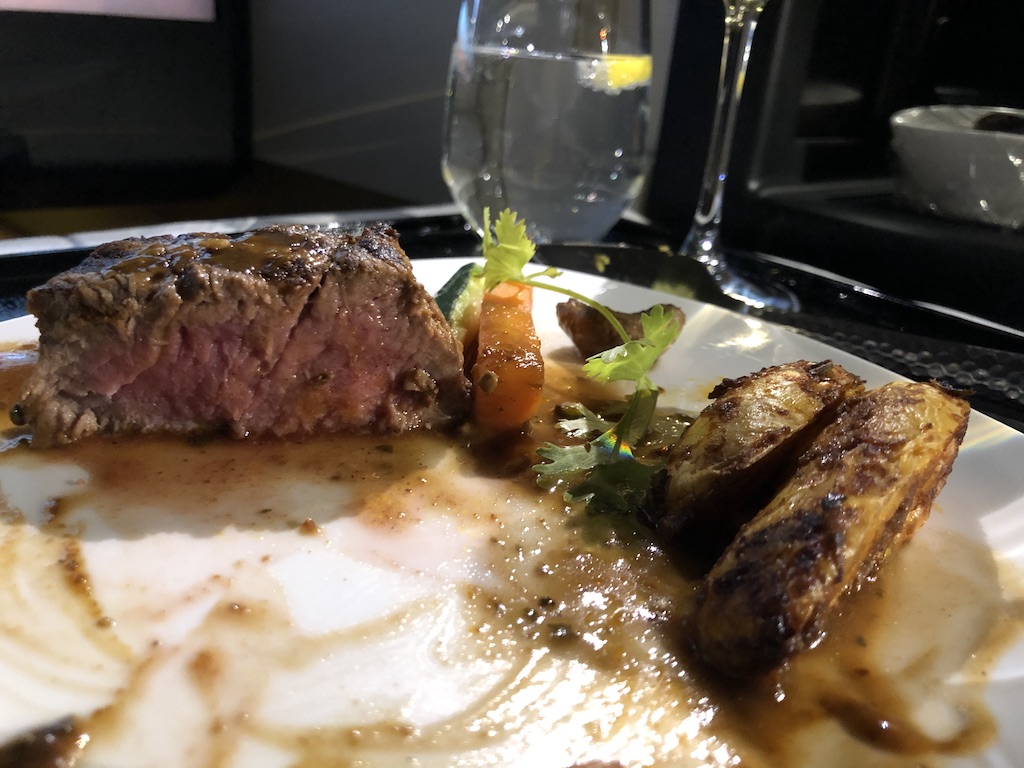 Das Steak hat dafür geschmacklich überzeugt, der Shiraz war für mich der perfekte Begleiter dazu. Die Crew achtete darauf, uns immer gemeinsam zu bedienen und brachte Essen und Getränke gleichzeitig von jeder Seite.