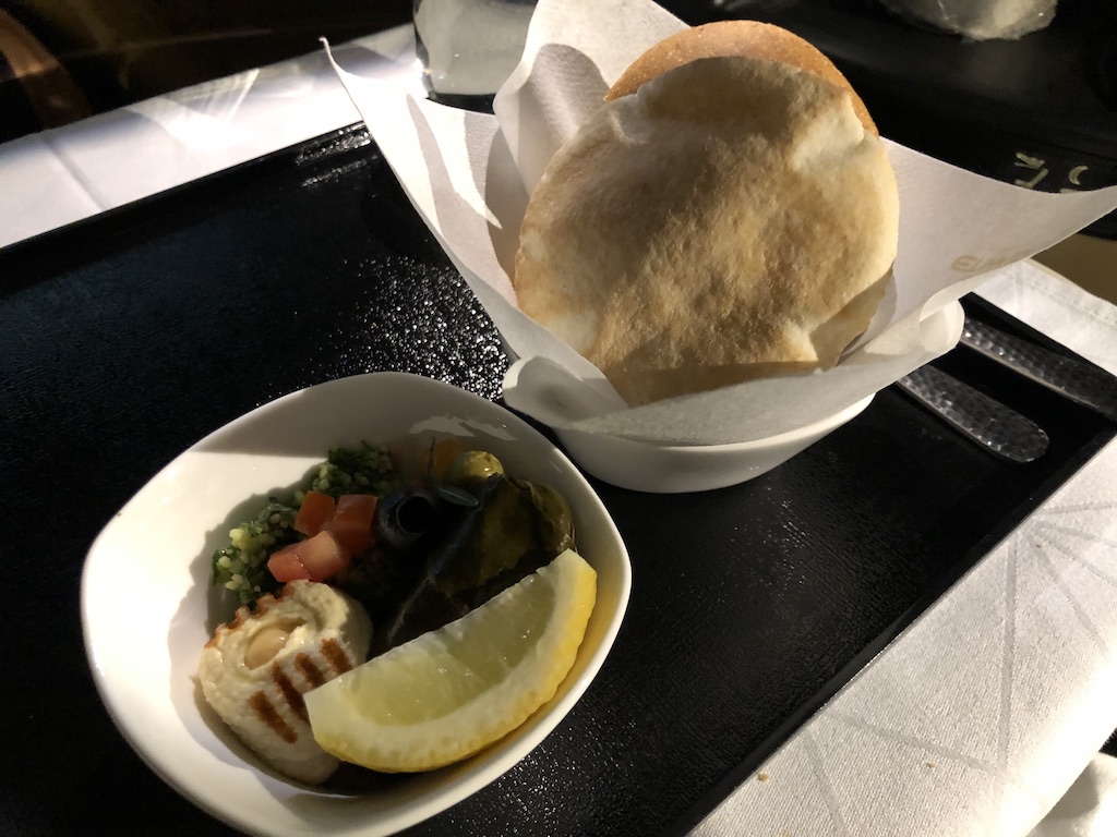 Die arabische Mezze scheint der gängigste und beliebteste Starter zu sein und kommt auf dem kurzen Flug automatisch mit. Die Hauptgänge waren schön angerichtet, doch leider nur noch lauwarm.