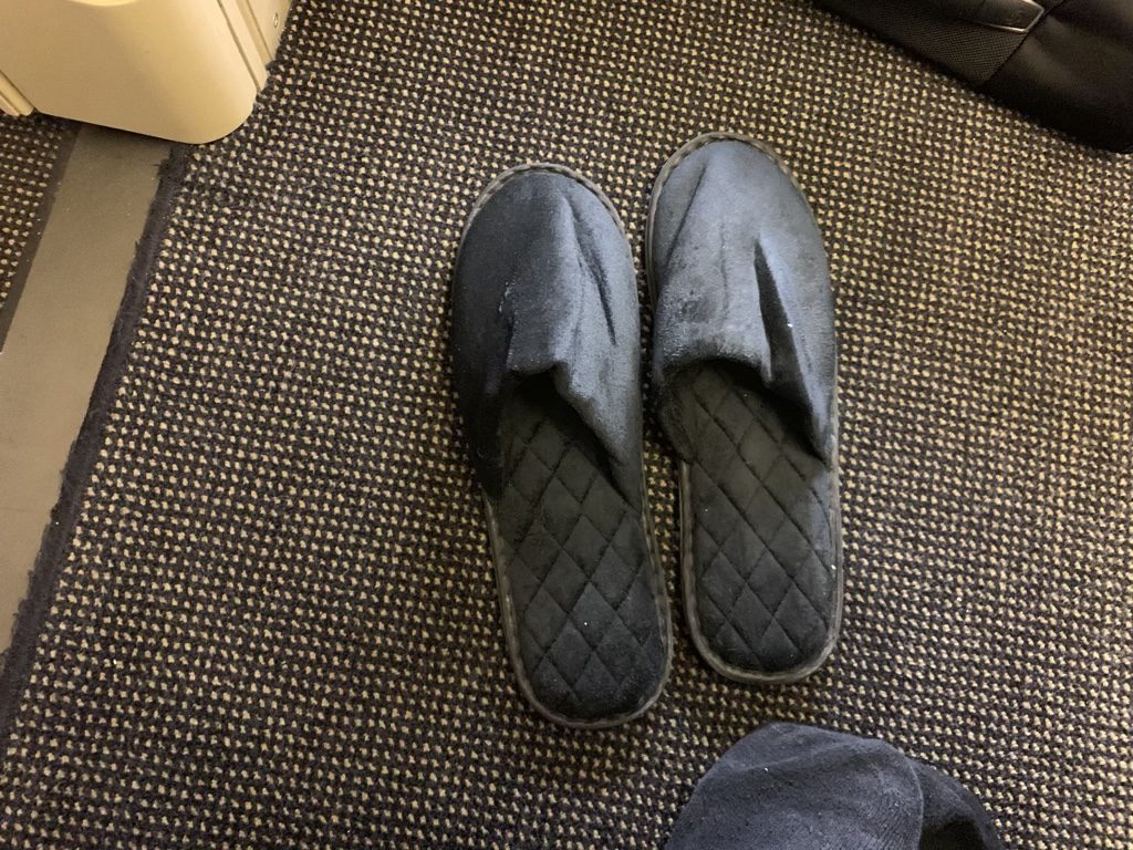 Kurz nachdem ich mich gesetzt habe, wurden mir auch ein Amenity Kit, ein Pyjama und wenig später auch Slipper überreicht, wobei man die Slipper schön am Boden der Suite drapiert hat. Das Amenity Kit und den Pyjama hat man etwas wortkarg einfach auf den Ottomane gelegt.
