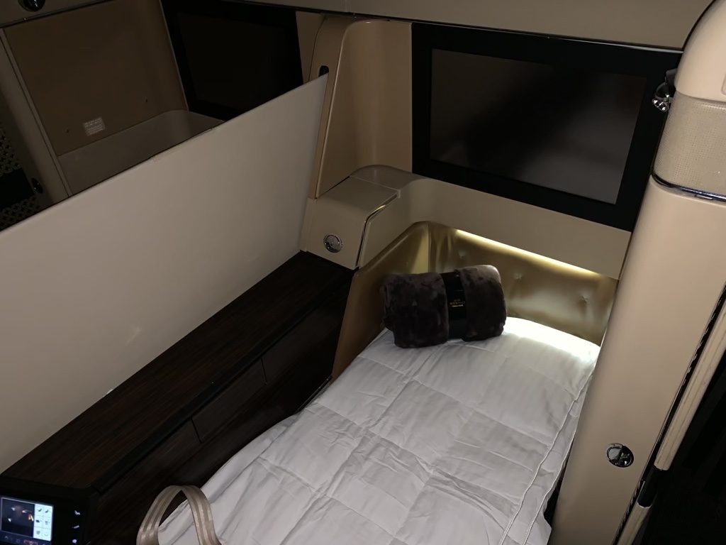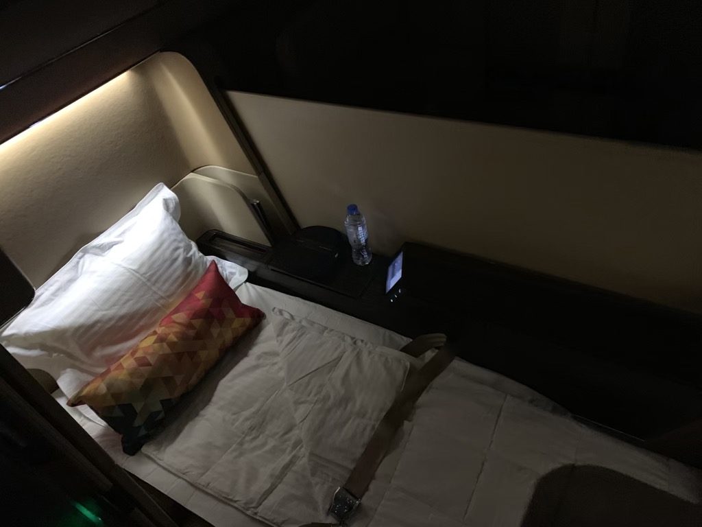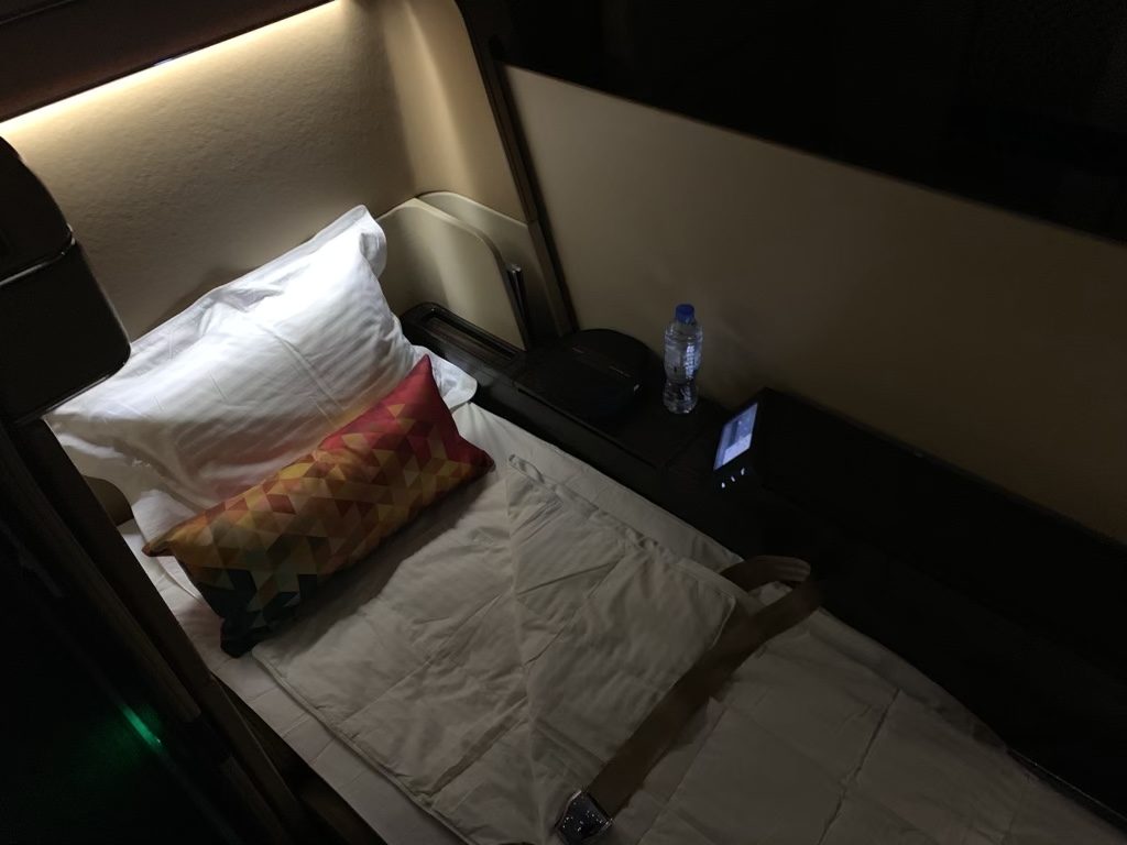 Man muss aber ehrlich sagen, dass das Bett für eine First Class recht schmal war und dass es hier Airlines gibt, die mehr Platz bieten, was gerade beim Schlafen viel ausmacht. Wer würde schon in einem 5 Sterne Hotel ein Bett mit 70cm Breite akzeptieren?