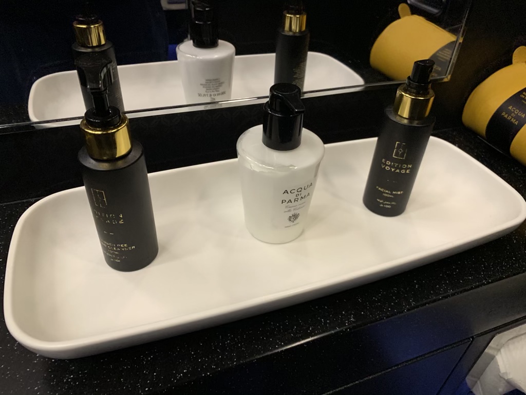 Der Inhalt der Amenity Kits mit den Aqua di Parma Produkten konnte sich auch durchaus sehen lassen, allerdings bin ich kein Fan davon, wenn alles im Amenity Kit in Folie eingezogen ist. Gerade bei Socken und Augenmaske macht dies eigentlich wenig Sinn.