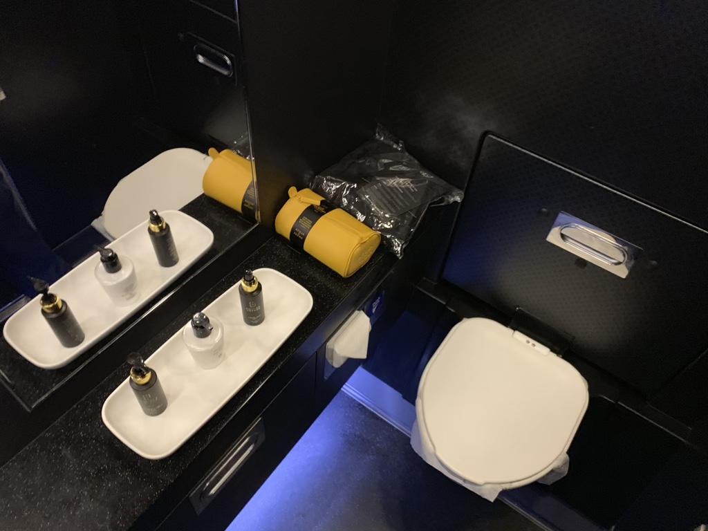 Die Gestaltung der Toiletten mit dem schwarze Lackwänden erinnerte mich ein wenig an eine Disko aus dem letzten Jahrzehnt und weniger an ein Flugzeug, aber die Idee war wenigstens etwas Neues.