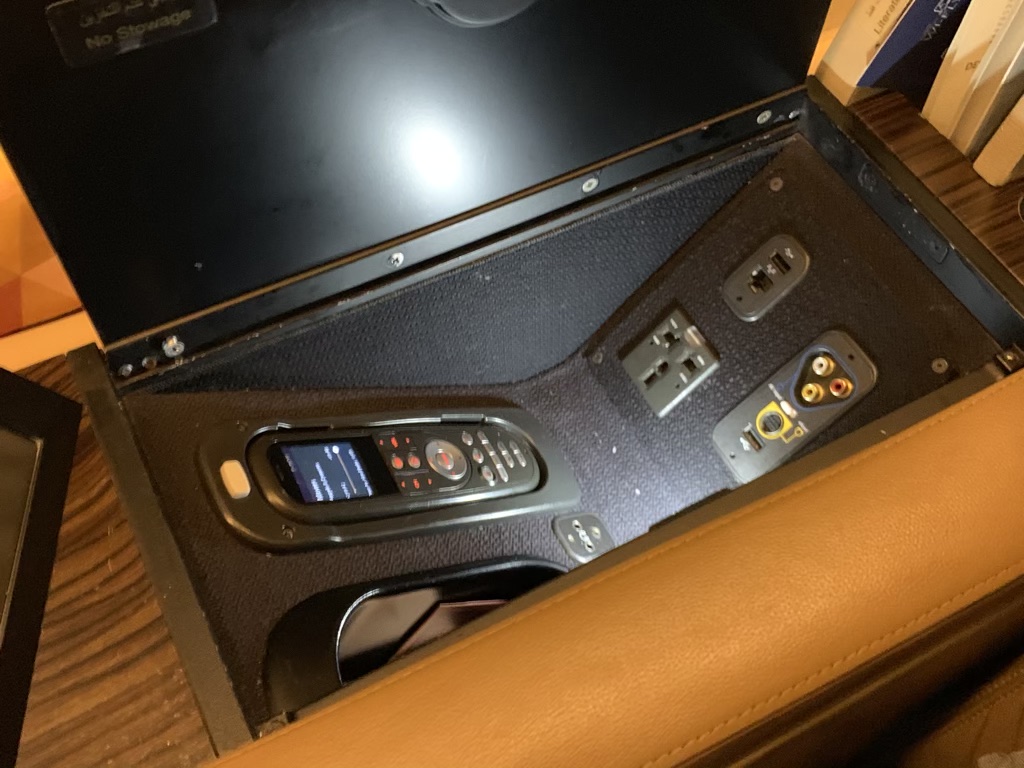 Die Ablage neben dem Sitz nahm auch die Steckdose, einen USB Anschluss und den Controller für das IFE auf. Eigentlich war dies sehr aufgeräumt, jedoch musste man wenn man hier z.B. den Pass und seinen Geldbeutel deponiert hatte immer ein wenig graben, wenn man an die Steckdose wollte.