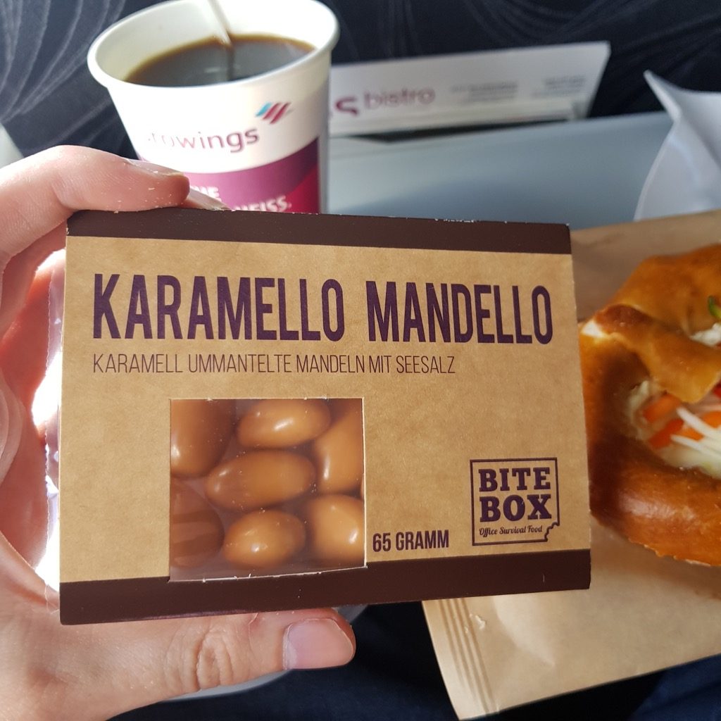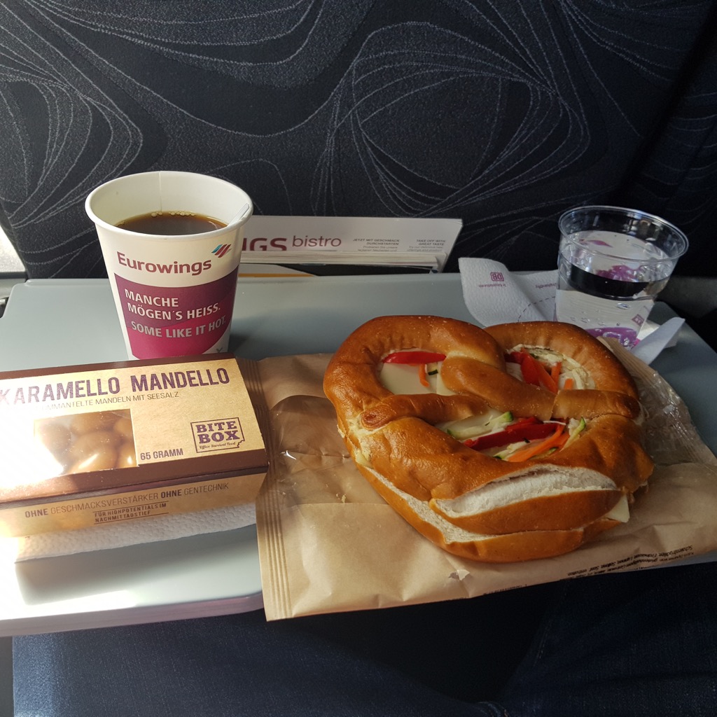 Bei Lufthansa bekommt man innereuropäisch ein Tablett, ohne wirkliche Auswahlmöglichkeit. Wer kalten Fisch nicht mag kann also durchaus mal Pech haben. Bei Eurowings kann man einfach aus dem Bord-Bistro nach Herzenswunsch bestellen. Eine Mengenbeschränkung konnte ich nicht bestätigen, aber Hamstern ist wohl verboten. Ich entschied mich für einen Brezel mit Käse, die Erwartung an einen „Ditsch“-Brezel wurde nicht erfüllt. Geschmacklich kein Höhepunkt und eher papig wie einfache Aufbackware mit zäher Konsistenz – für ein Flugzeugsandwich aber erträglich, hatte schon schlimmeres.