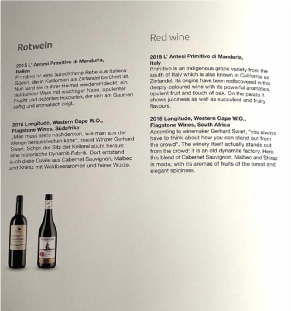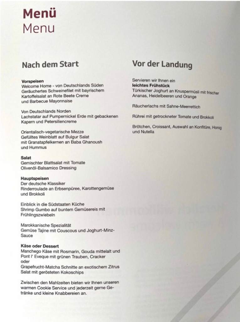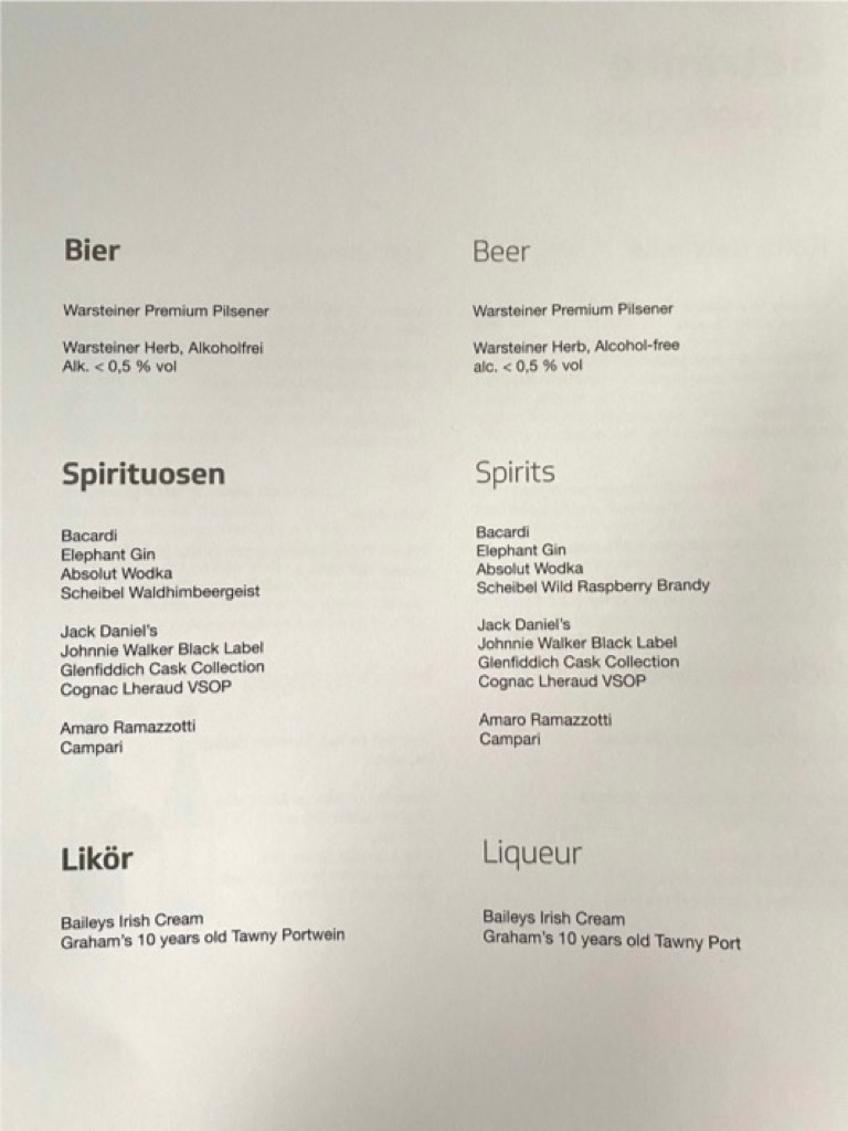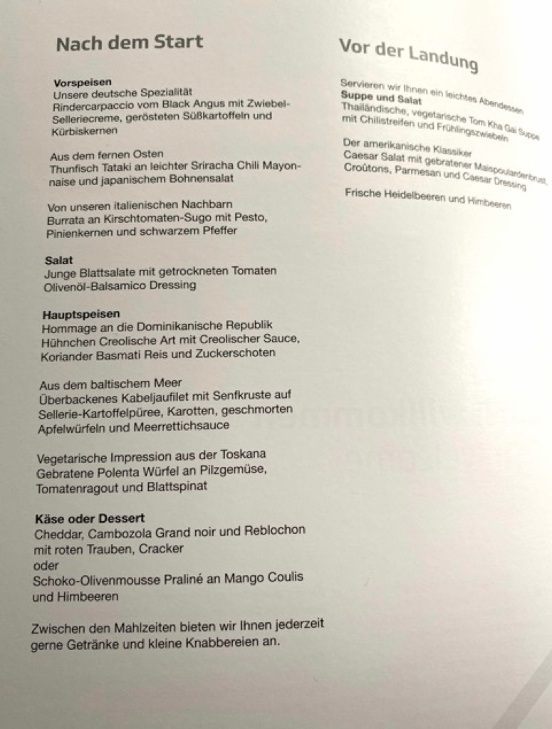Auf der Rückreise gab es dann auch was Alkoholisches vor dem Take-Off. Wir haben euch auch mal das Menü abfotografiert, leider gab es die vegetarische Option nicht, was man weniger der Airline als dem Caterer vor Ort in Punta Cana zu Lasten legen muss. In Sachen Menü gibt es auf dem Heimweg schließlich eine „typisch Deutsche“ welcome home Option.