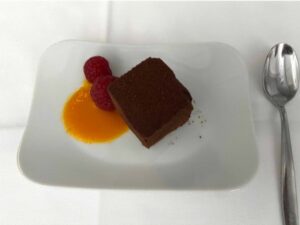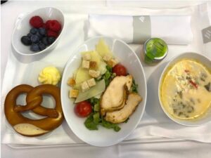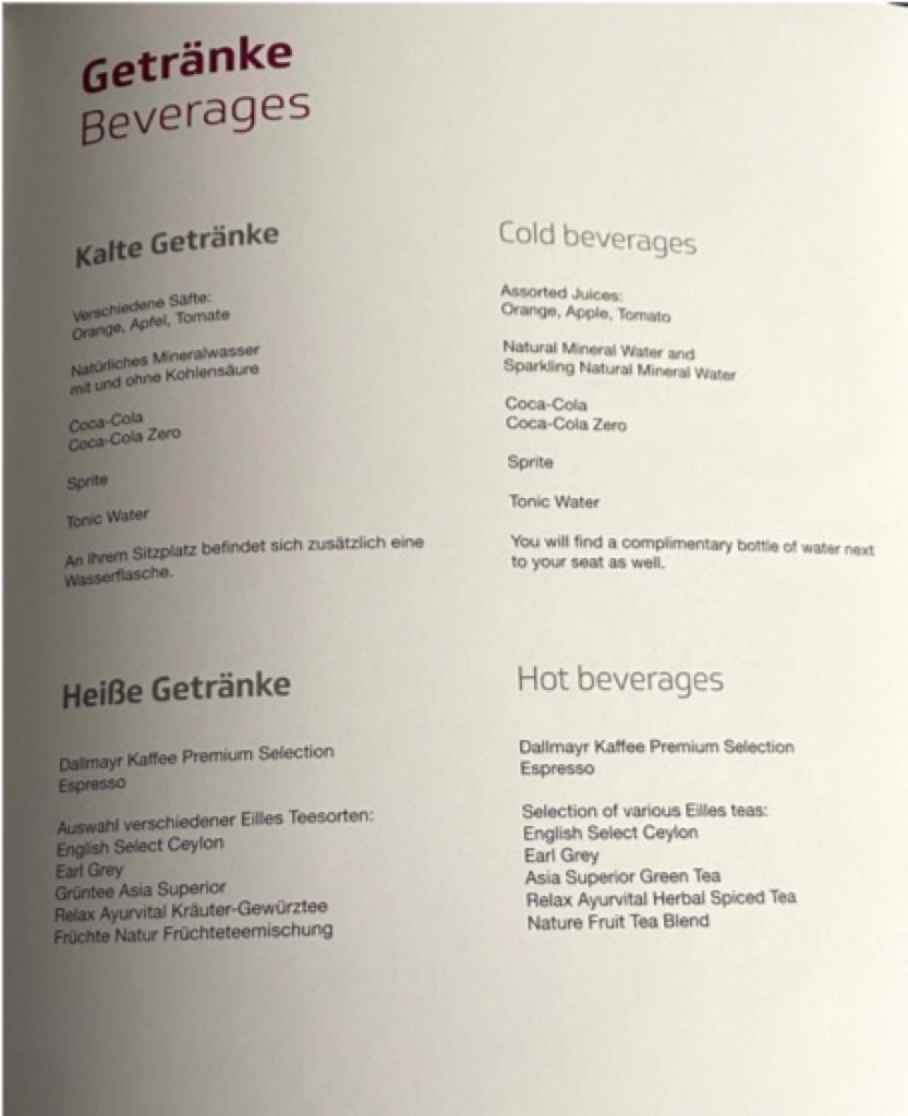Die Vorspeise wurde noch vom Trolley geliefert, der Rest dann vom Tablett. Insgesamt war das Essen durchweg gut und schmackhaft. Was das Ganze aber wirklich zu einem Erlebnis gemacht hat, war die Motivation der Crew! Das möchte ich wirklich mal hervorheben. Es war noch so viel Begeisterung spürbar, dass man endlich wieder fliegen durfte – das hat wirklich viel Freude gemacht und sich auch positiv von den vielen weniger motivierten Crews bei der Muttergesellschaft abgehoben. Wirklich toll! Die Crew stellt sich übrigens nur mit Vornamen vor, um (Aussage des Pursers) „das Lockere in den Vordergrund zu stellen“. Da muss jede(r) selbst entscheiden, wie man das findet.