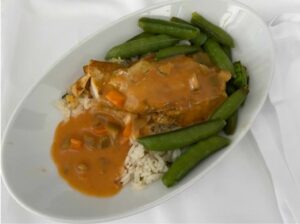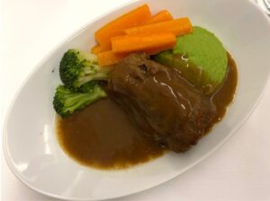Rinderroulade an Erbsenpüree mit Karottengemüse und Brokkoli.