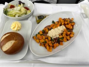 In der Business Class wurden vier Cabin Attendants eingesetzt. Vor dem Start gab es Orangensaft oder Wasser, jedoch kein alkoholisches Getränk. Das hing wohl damit zusammen, dass ein Trolley falsch geliefert wurde. Unmittelbar vor dem Take-Off wurde das aber noch geändert, so dass es während des Fluges auch Champagner gab. Im Reiseflug wurden dann die guten alten Macadamia-Nüsse und das Menü gereicht. Ich fand, das hörte sich alles ziemlich gut an, da kann sich jeder auf den Fotos selbst überzeugen. 😉 Man möchte bei Eurowings Discover auf dem Flug zur Urlaubsdestination jeweils ein lokales Gericht bieten sowie eine vegetarische Option. Vor der Landung gibt es dann je nach Uhrzeit nochmal ein warmes Gericht oder ein leichtes Frühstück.