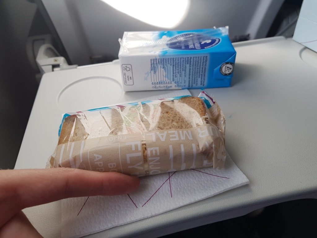 Mit Spannung erwartete ich den Bordservice, welcher nur wenige Minuten nach dem Ausschalten der Anschnallzeichen begann. Bei Eurowings muss man die Economy in Basic und Smart unterscheiden. Der Basic-Tarif beinhaltet neben Flug nur ein Handgepäckstück, alles weitere ist kostenpflichtig. Sitzplatzreservierung, Koffer sowie Snacks und Getränke kosten hier extra, damit sind sie im Branchenschnitt und auch mit dem Light-Tarif der Lufthansa vergleichbar. Das Buy on Board genannt „Wings Bistro“ ist mit dem von anderen Low-Cost-Carriern und Ferienfluggesellschaften identisch. In Economy Smart gab es zum Zeitpunkt des Fluges im Sommer 2018 eine kleine Box mit Sandwich und Wasser sowie eine nachfolgende Getränkerunde mit üblichen Heiß- und Kaltgetränken. Natürlich besteht auch für Smart-Kunden die Möglichkeit weitere Produkte käuflich zu erwerben, eine gute Lösung gegen Hunger oder extremen Durst.