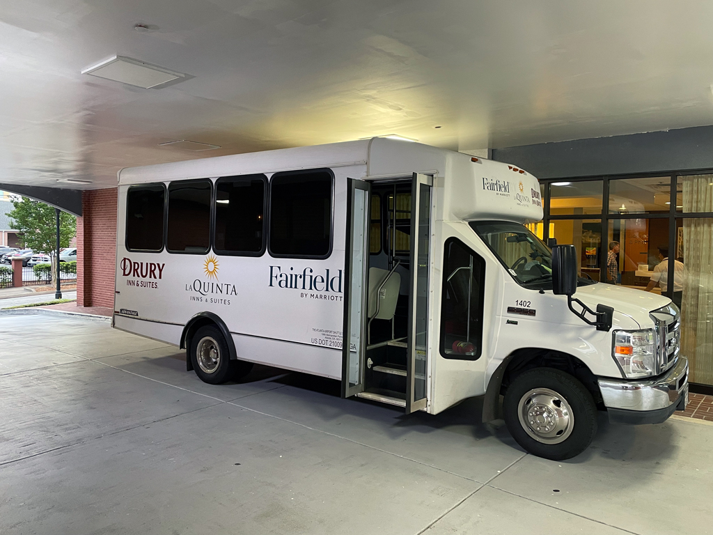 Der Transfer von und zum Flughafen ist denkbar leicht. Das Gratis-Shuttle fährt an der Halteposition 9/10 ab. Das Fairfield Inn Airport North teilt sich den Bus mit dem La Quinta und dem Drury Inn. Vor Einstieg ist es sinnvoll nachzufragen, ob es das Shuttle zum „North“ ist, denn südlich vom Flughafen gibt es noch ein Fairfield Inn.