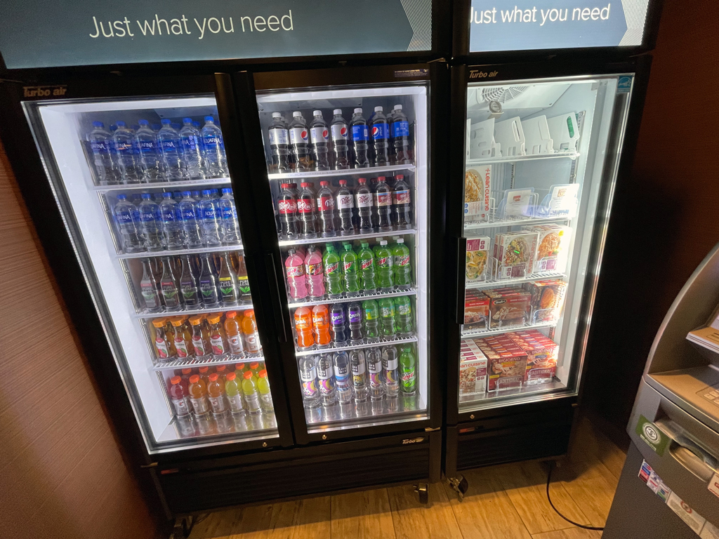 Grundsätzlich gibt es dort Kaffee mit und ohne Koffein sowie heißes Wasser für Tee und Oatmeal. Wer bisher nichts Geeignetes zum Essen gefunden hat, findet vielleicht etwas bei den drei Cerealienspendern.