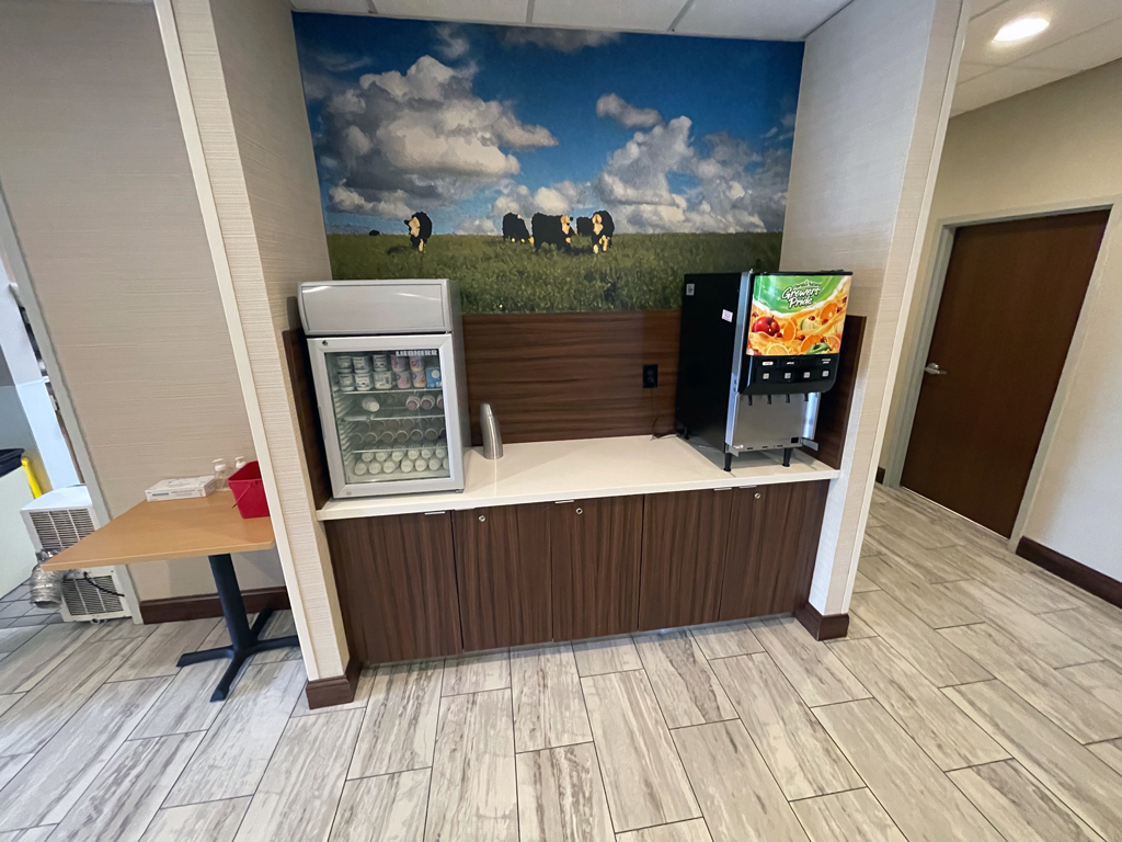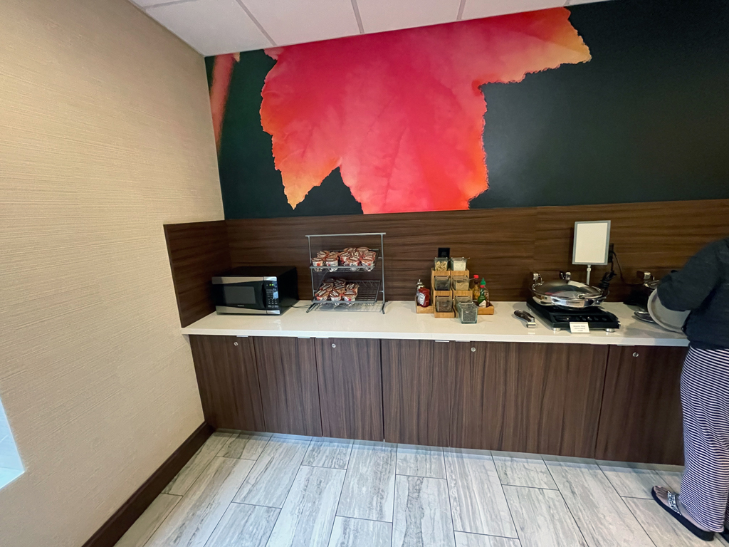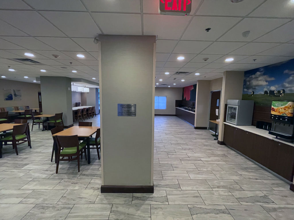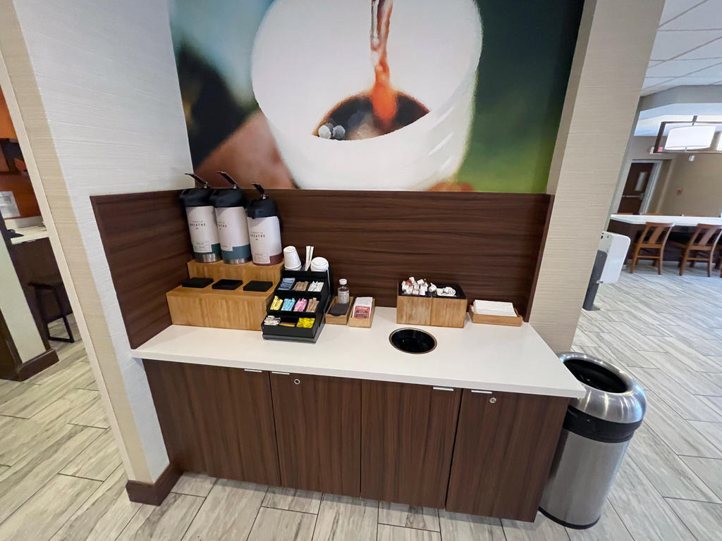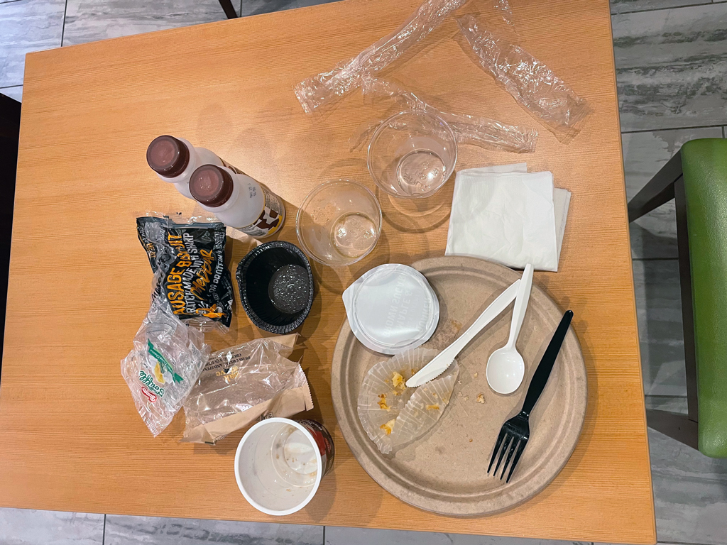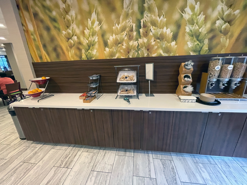 Das Frühstück im Fairfield Inn ist für alle Gäste kostenlos. Richtig ausgewogen ist die Ernährung dabei nicht und ich habe noch nie so viel Plastikmüll mit einer einzigen Mahlzeit hinterlassen. Das war unglaublich. Die drei warmen Speisen, die ich gegessen habe, schmeckten immerhin alle unterschiedlich und waren genießbar. Mehr habe ich nicht erwartet und auch nicht bekommen. Keine davon hat sich für eine zweite Portion aufgedrängt.