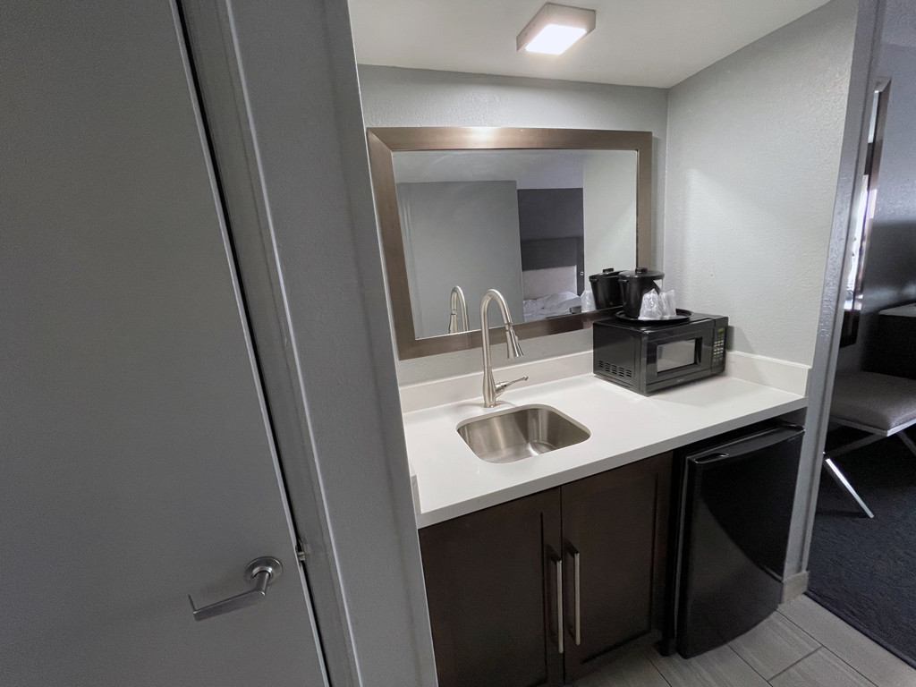 Die „Küchenzeile“ bietet neben dem Spülbecken und dem Kühlschrank noch eine Mikrowelle, um Speisen zu erhitzen.