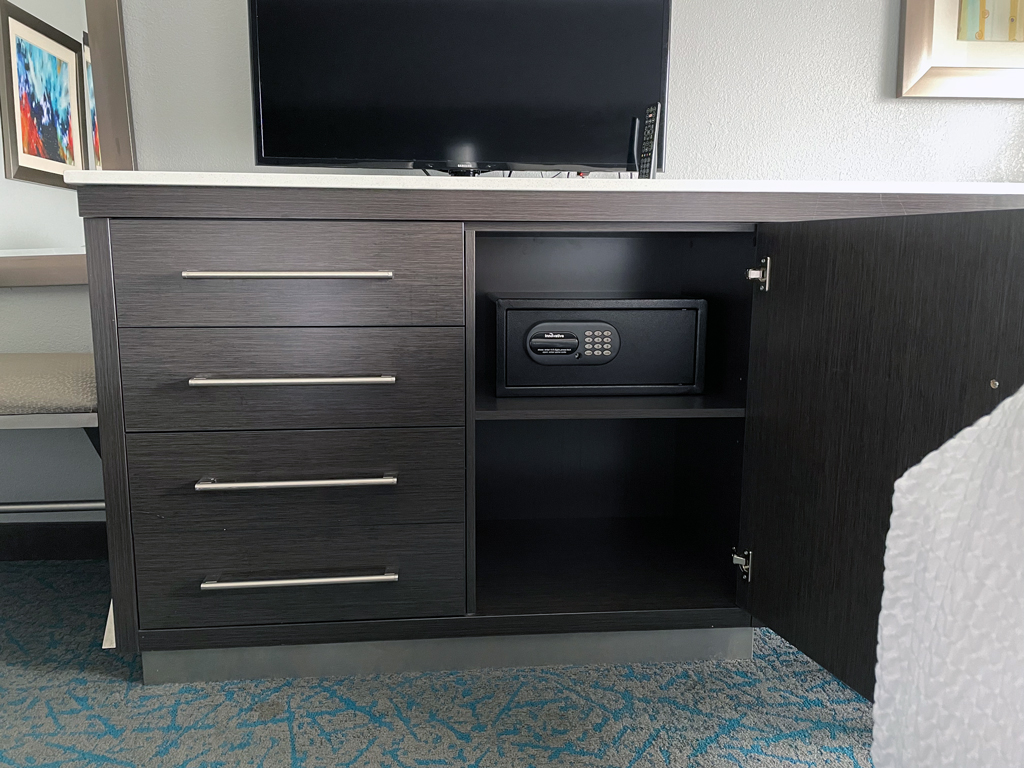 Der Schreibtisch ist unter dem Highboard verstaut. Da er auf Rollen gelagert ist, kann man ihn leicht herausziehen. Durch die Unterbringung unter dem Highboard ist der Schreibtisch nicht sehr hoch, weswegen der Schreibtischstuhl extrem niedrig ist. Dadurch ist die Sitzposition – gerade für große Menschen – alles andere als ideal. Einen ganzen Arbeitstag möchte man deshalb sicherlich nicht ins Zimmer des Fairfield Inns verlegen.