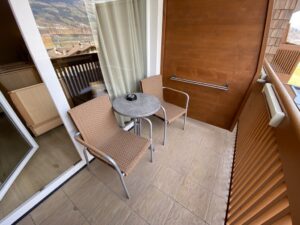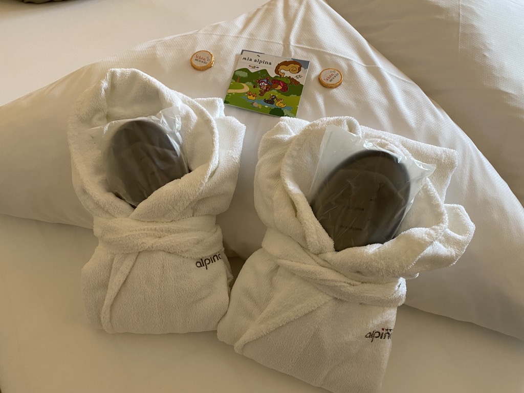 Im Zimmer gab es auch eine kleine Sitzecke, die man in eine Schlafcouch (nicht auf den Bildern zu sehen) hätte umwandeln können. Neben der Sitzgruppe führte ein bodentiefes Fenster zum Balkon, auf dem man wunderbar verweilen kann. Im Zimmer warteten bereits Bademäntel und Hausschuhe für uns und Kapuzenhandtücher und Bilderbücher für die Kinder. Ein tolles Willkommensgeschenk!