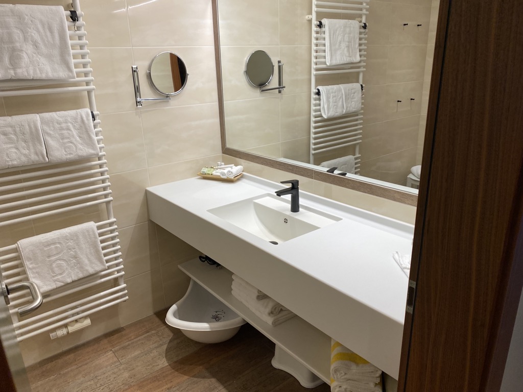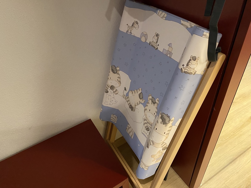 Ausgestattet war das Zimmer mit einem Badezimmer mit Walk-In Dusche, Waschbecken, Babybadewanne und Amenities. Das WC war separiert und dort gab es einen speziellen Windeleimer. Gegenüber des Badezimmers befand sich der Kleiderschrank, eine kleine Garderobe und der Klappwickeltisch.