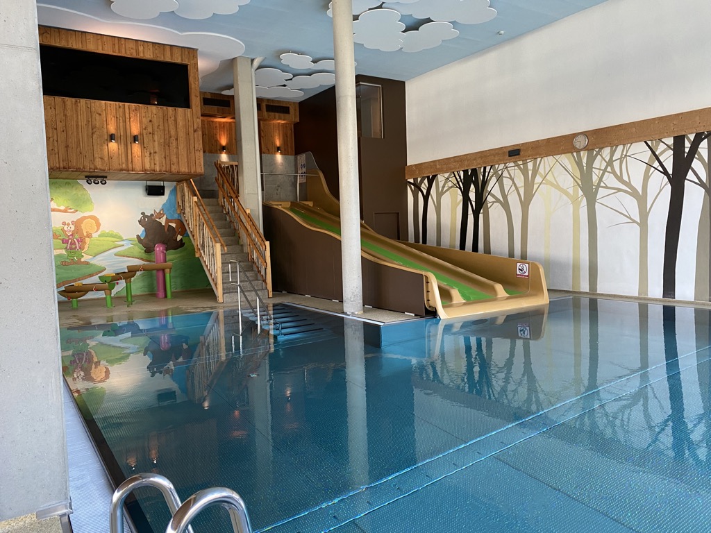 Das Familienhotel bietet auch ein Kinder- / Familienschwimmbad. Direkt neben den Becken und im oberen Bereich, der über eine Treppe erreichbar ist, gibt es ausreichend Liegemöglichkeiten. Sogar Schwimmhilfen für die Kleinsten und ein bisschen Badespielzeug ist vorhanden.