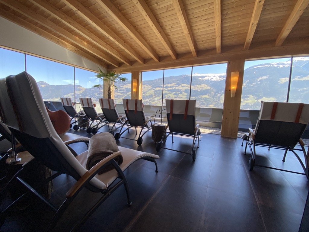 Hier gibt es neben einem großen Ruhebereich mit tollen Blick einen Bereich, in dem man sich Tee kochen und an Zeitschriften und Wasser bedienen kann. Von hier aus gelangt man auch in verschiedene Saunen, zu den Duschen und in ein Dampfbad. Ich war gegen 11 Uhr im Wellnessbereich und er war leer. Ich war die einzige anwesende Person, was mich sehr überrascht hat.