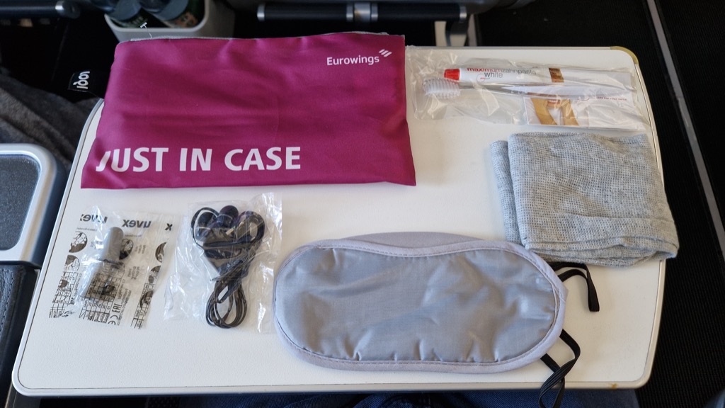 In der Premium Economy inklusive sind ein Amenity Kit, u.A. mit Kopfhörer, Schlafmaske und Socken, sowie eine Decke, ein Kissen und eine kleine Wasserflasche. Das alles war bereits am Platz bereitgelegt, lediglich die Amenity Kits waren nicht an alle Plätze verteilt worden, wir bedienten uns dann bei ein paar frei gebliebenen Sitzen im Mittelteil.