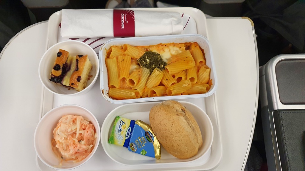 Der Service an Bord war gut, als Begrüßungsgetränk wurde ein alkoholfreier Fruchtcocktail serviert. Es gab zwei Mal warmes Essen (Mittagessen mit Auswahl Fleischgericht oder Pasta, sowie ein warmes Frühstück mit Apfel-Zimt-Pfannkuchen, eine Menükarte gab es leider nicht). Angerichtet wurde das Ganze auf Porzellangeschirr, lediglich das warme Gericht wurde in der klassischen Aluschale serviert. In der normalen Economy Class gab es ebenfalls ein warmes Mittagessen, aber nur ein kaltes Frühstück. Vor den Essen wurde jeweils auch noch ein heißes Tuch gereicht. Zu allen Mahlzeiten gab es zwei Runden Getränkeservice mit der üblichen Auswahl an Heiß- und Kaltgetränken, in der PE sind eine Sorte Weiß- und Rotwein, sowie Bier (mit und ohne Alkohol) im Gegensatz zur Economy kostenlos. Spirituosen und andere Weine gibt es nur gegen Aufpreis, die kostenfreien Weine waren aber durchweg gut.