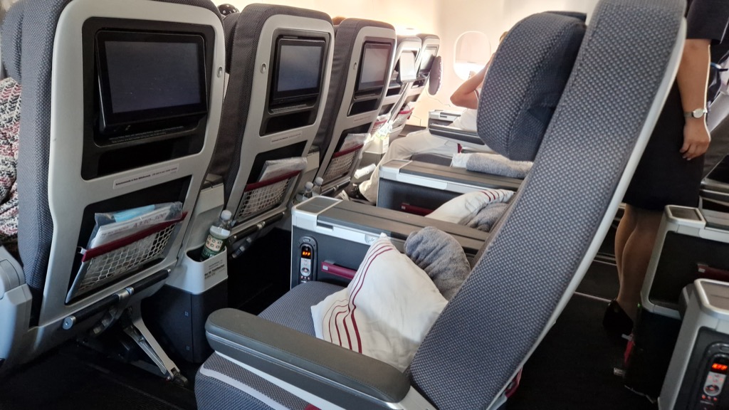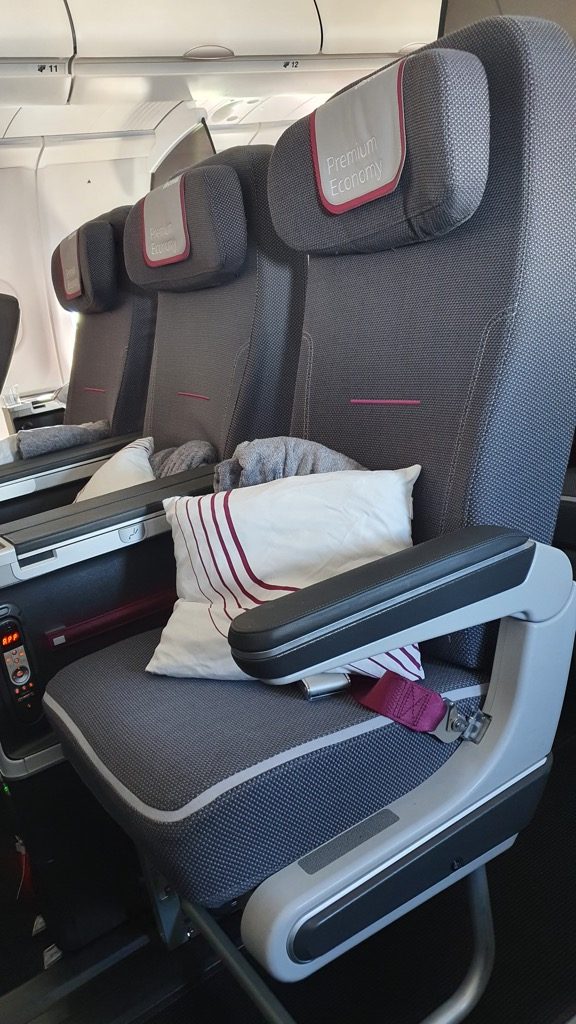 Die Premium Economy-Sitze sind wie gewohnt bequem und geräumig, mit genügend Ablageflächen für alles, was man auf einem Langstreckenflug so braucht. Sowohl Sitzbreite als auch Sitzabstand sind deutlich größer, als bei den normalen Economy-Sitzen. Außerdem teilt man sich mit dem Nachbarn eine extrabreite Armlehne, so dass jeder Passagier genügend Armfreiheit hat. Alle PE-Sitze haben einen 12 Zoll großen Touchscreen-Monitor, Fußstützen und einen angenehmen Neigungswinkel zum Schlafen. Nur die erste Reihe direkt an der Trennwand hat zusätzlich auch eine Wadenstütze und den Monitor in der Armlehne, so dass der Sitz insgesamt etwas schmaler wird. Dieser Ausklapp-Monitor hat auch eine etwas kleinere Bildschirmdiagonale von 11 Zoll. Jeder Sitz hat zudem eine USB-Buchse am Monitor, zusätzlich gibt es eine 230V-Steckdose zwischen den Sitzen.