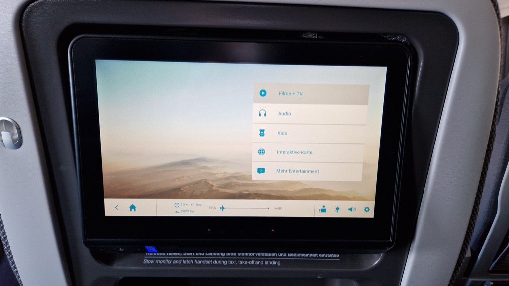 Das Bordentertainment war ganz okay, aber nicht Lufthansa-Standard, und schon gar nicht vergleichbar mit den fliegenden Videotheken von Emirates oder Singapore Airlines. Zusätzlich gibt es noch per Bord-WLAN weitere Angebote wie eJournals oder Spiele für das eigene Handy oder Tablet. Nach mehr als zwei Flügen wird aber insbesondere das Filmprogramm definitiv öde, da es nur eine sehr begrenzte Auswahl an Blockbustern und älteren Filmen gibt. Auch das Kinderprogramm ist leider überschaubar. Neben ein paar Animationsfilmen und einer Handvoll einzelner (!) Folgen diverser Kinderserien gibt es noch fünf Alben mit Kinderliedern. Definitive Empfehlung: Tablet mitnehmen mit den Lieblingsfilmen und -serien der Kinder.