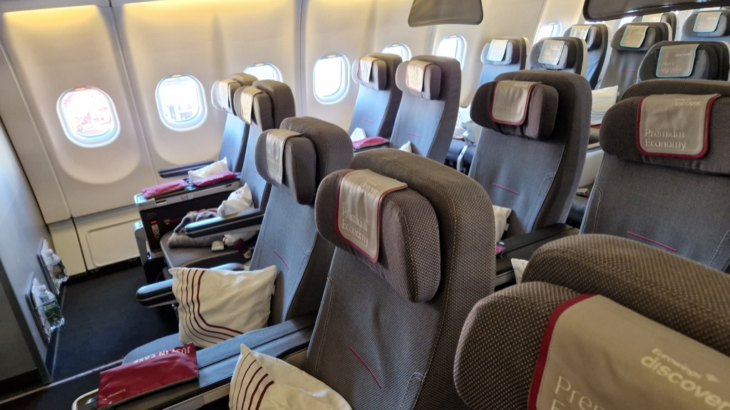 Der Premium-Economy-Bereich ist zur „normalen“ Economy Class nur durch einen kleinen Sichtschutz in Kopfhöhe abgetrennt. Hinter den PE-Sitzen folgen zunächst ein paar Reihen Economy-Sitze mit Extra Legroom, bevor es mit der Standard-Economy weitergeht.