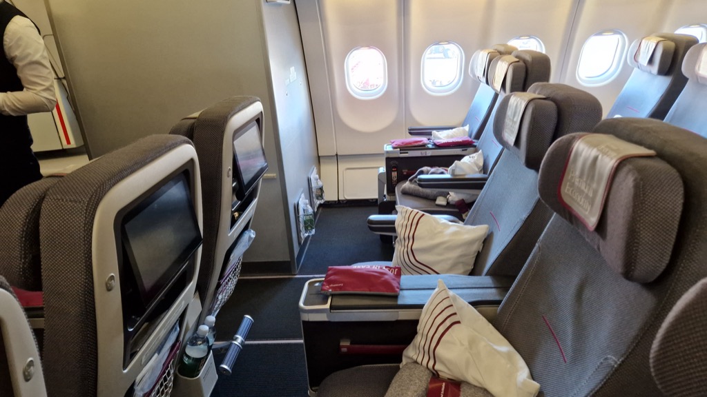 Im Flugzeug erfolgte dann auf Nachfrage die Aufklärung der ganzen chaotischen Situation: Der geplante Airbus A330-300 (A333) ist bereits vor Abflug in Frankfurt kaputt gegangen, daher wurde kurzfristig auf ein A330-200 (A332) umdisponiert. Der A332 ist ein ganzes Stück kleiner und hat nur zwei PE-Reihen in den Blöcken am Fenster und drei Reihen in der Mitte. Die Steuerbord-Reihen sind noch dazu als Crew Rest gesperrt. Damit ist die Premium Economy dann maximal halb so groß wie die des A333. Vom Flugzeugwechsel hat die Crew am Morgen auch erst erfahren, und war entsprechend „begeistert“ ob des limitierten Platzes für Passagiere und Crew.