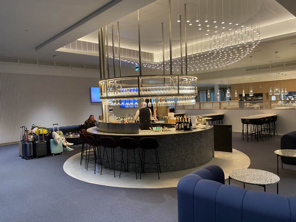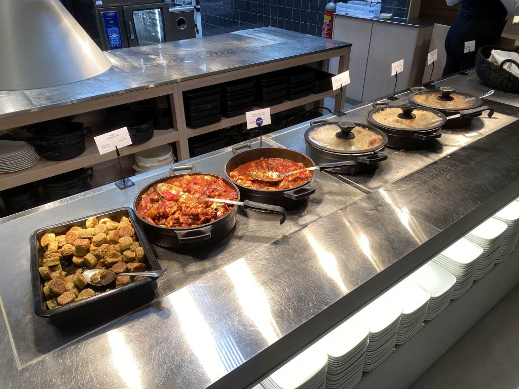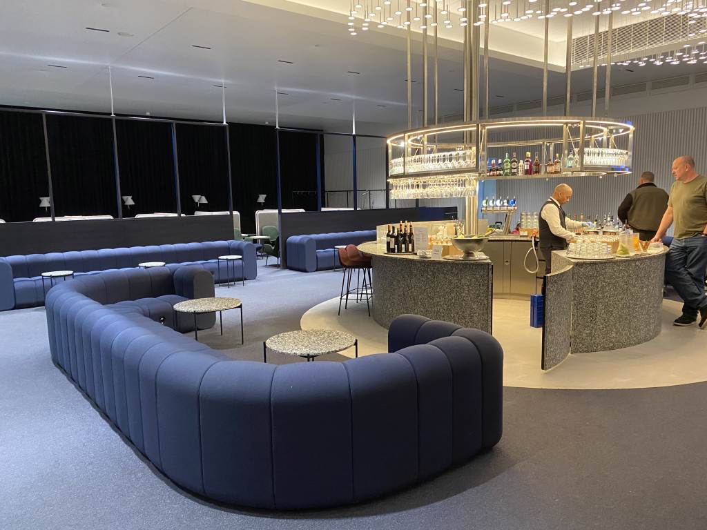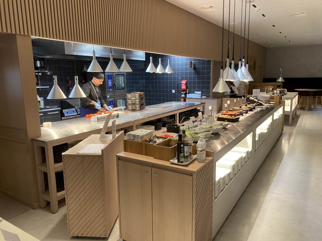 Auch in Bezug auf Büffet und Bar lässt die Lounge nicht zu wünschen übrig. Die Speisen werden vor den Augen der Gäste in der offenen Küche zubereitet und in der zentralen runden Bar bereitet ein Barkeeper Cocktails zu oder schenkt Euch ein Getränk ein.