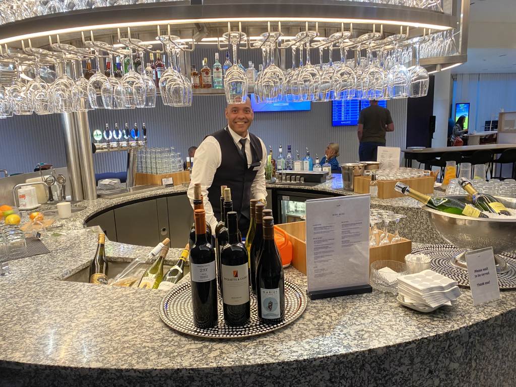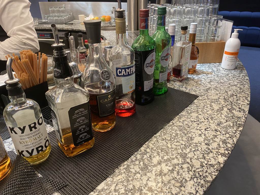 Für Softdrinks, Kaffee und Bier standen einzelne Selbstbedienungsstationen zur Verfügung. Für die meisten Gäste jedoch entscheidender: Die im hinteren Teil der Lounge angesiedelte „bemannte“ Bar. Hier werden vor Euren Augen Cocktails und Longdrinks zubereitet oder Euch auch ein Gläschen Wein eingeschenkt.