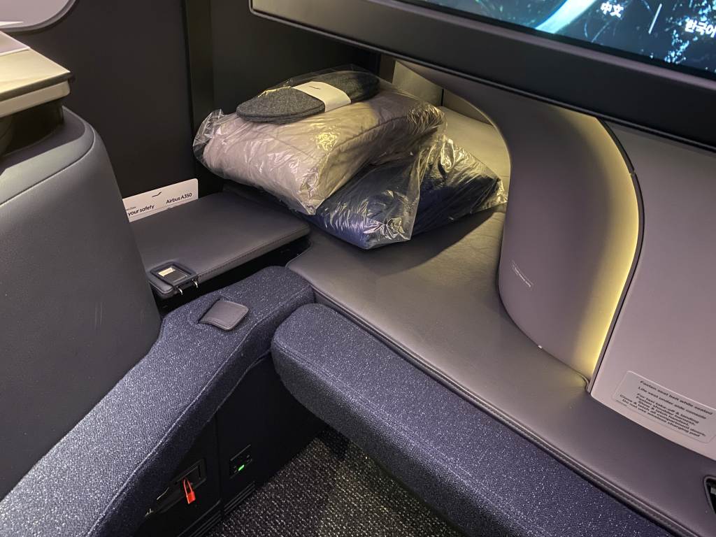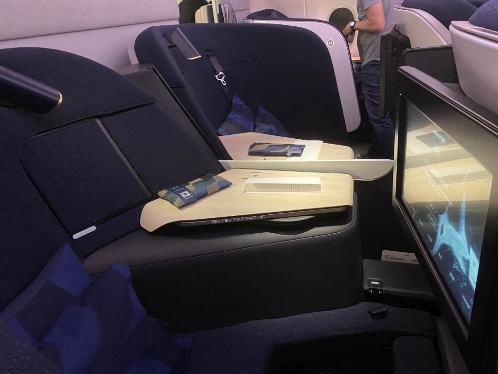 Viel wurde über den neuen Business Class Sitz berichtet, so auch bei uns. Und ich war hin und her gerissen. Auf vielen Fotos sah der Sitz echt eng aus. Und es gab von innereuropäischen Flügen schon berichte, dass der Sitz ohne zusätzliche Kissen echt hart ist, da jegliche Polsterung im Rücken fehlt. Auch der schmale Fußraum wurde im Vorfeld bemängelt.